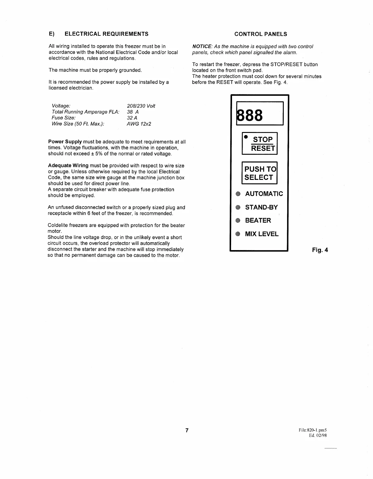 Coldelite UF 820 E TRONIC - Control Panel; Electrical Requirements