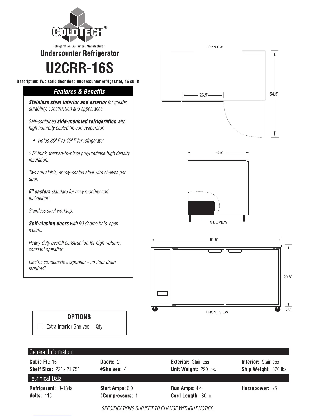 ColdTech U2CRR-16S - Features and Benefits; Product Description; Key Features; Options