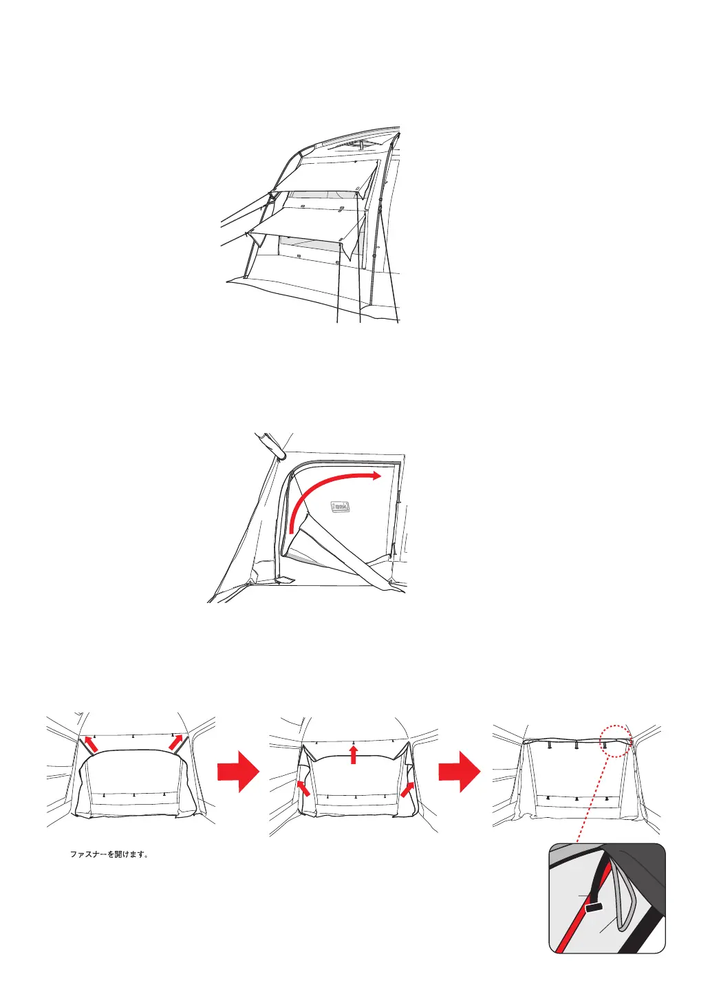 ジョイントフラップがついている出 入り口のフラップおよびメッシュを巻 き上げ、本体 のジョイントフラップを広げます。