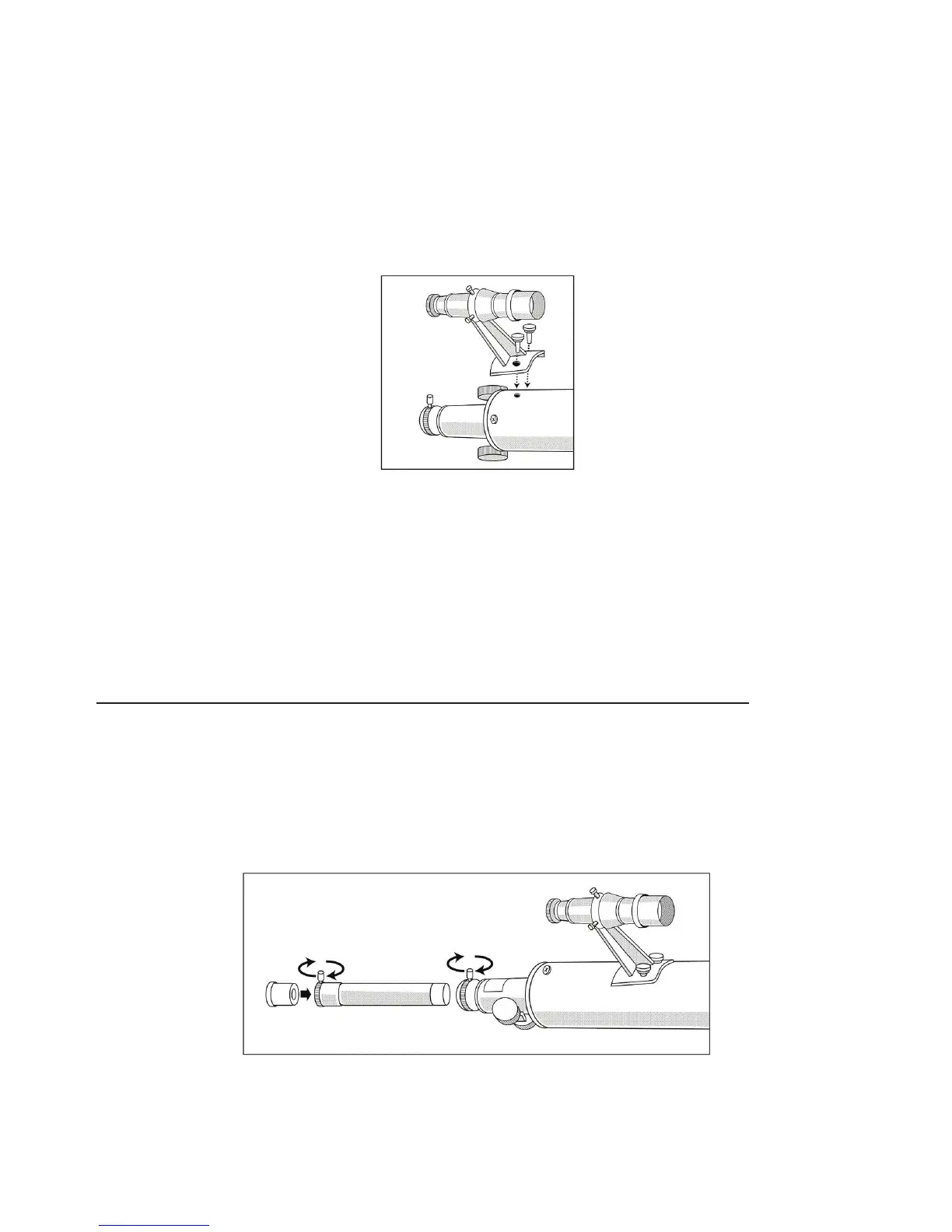 with the exposed holes in the telescope tube. Replace the two knurled thumbscrews and