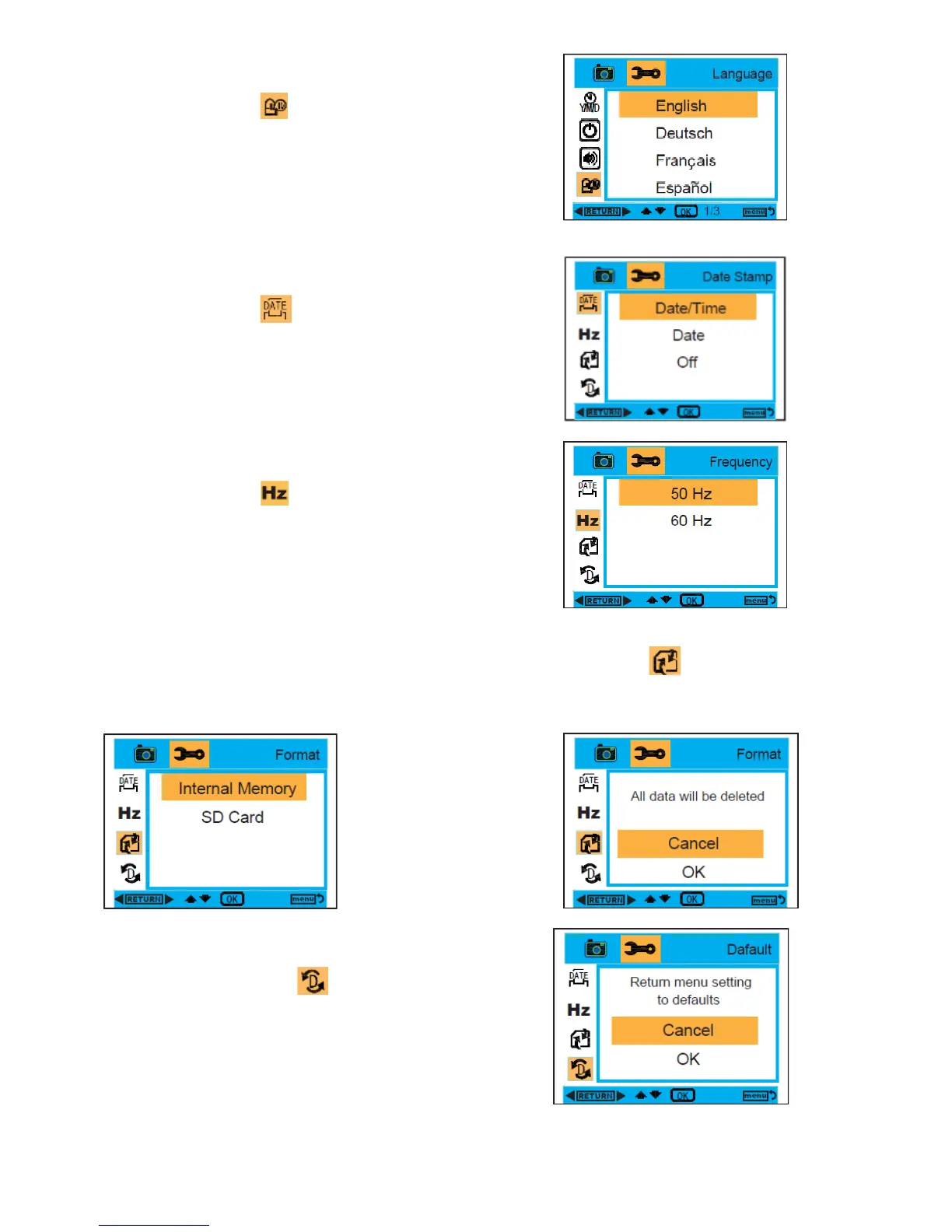 1. While in Camera or Video Mode, press the MENU and Right buttons to select Format.