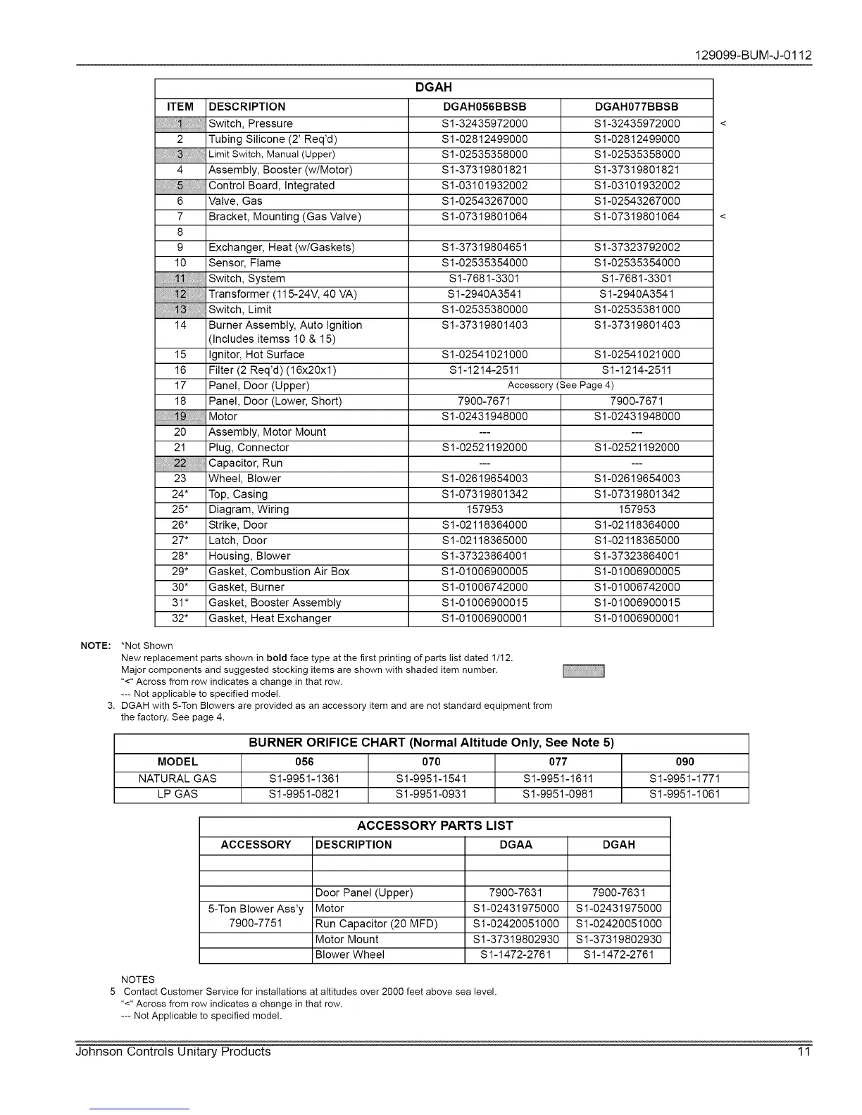 New replacement parts shown in bold face type at the first printing of parts list dated 1/12.