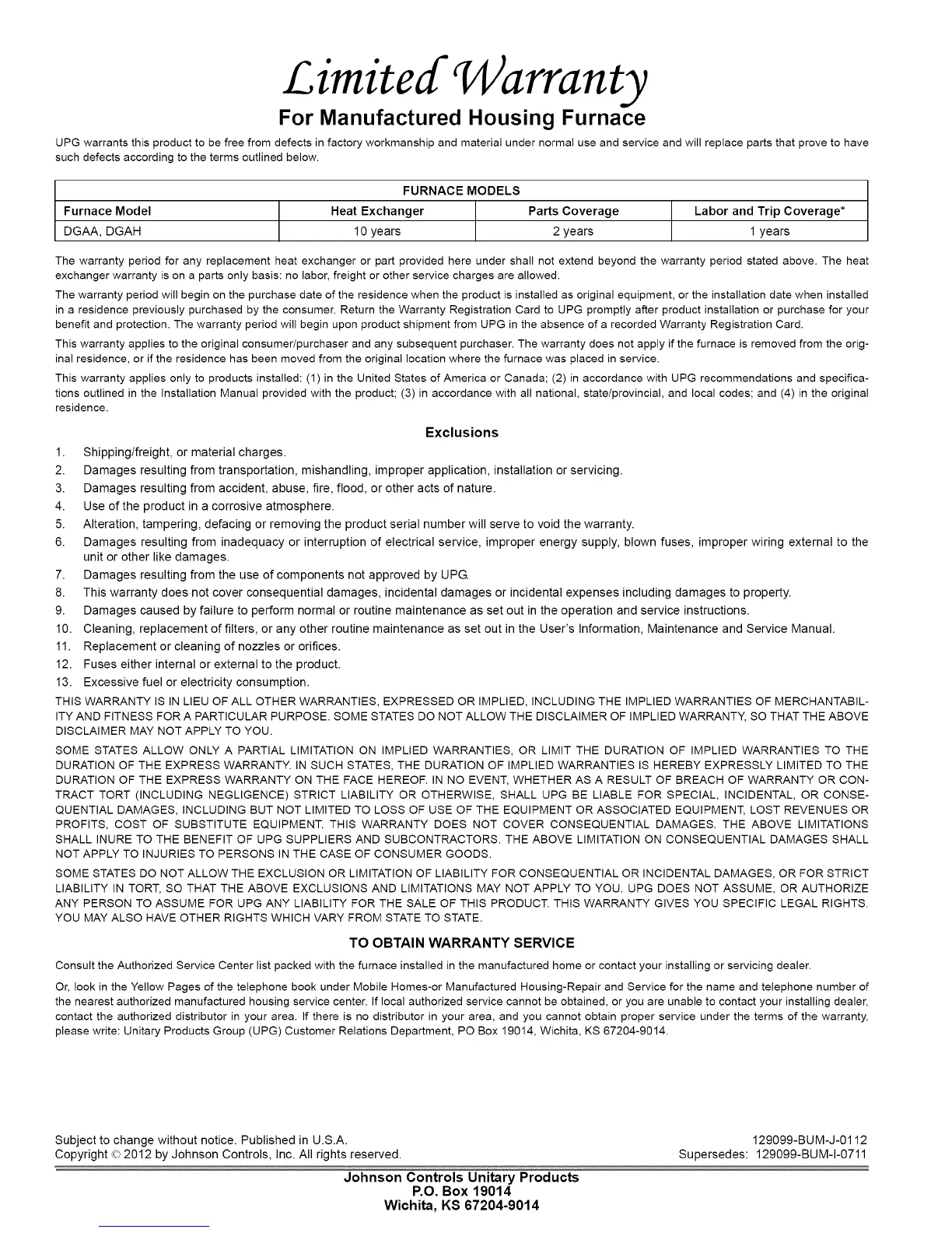 benefit and protection. The warranty period will begin upon product shipment from UPG in the absence of a recorded Warranty Registration Card.