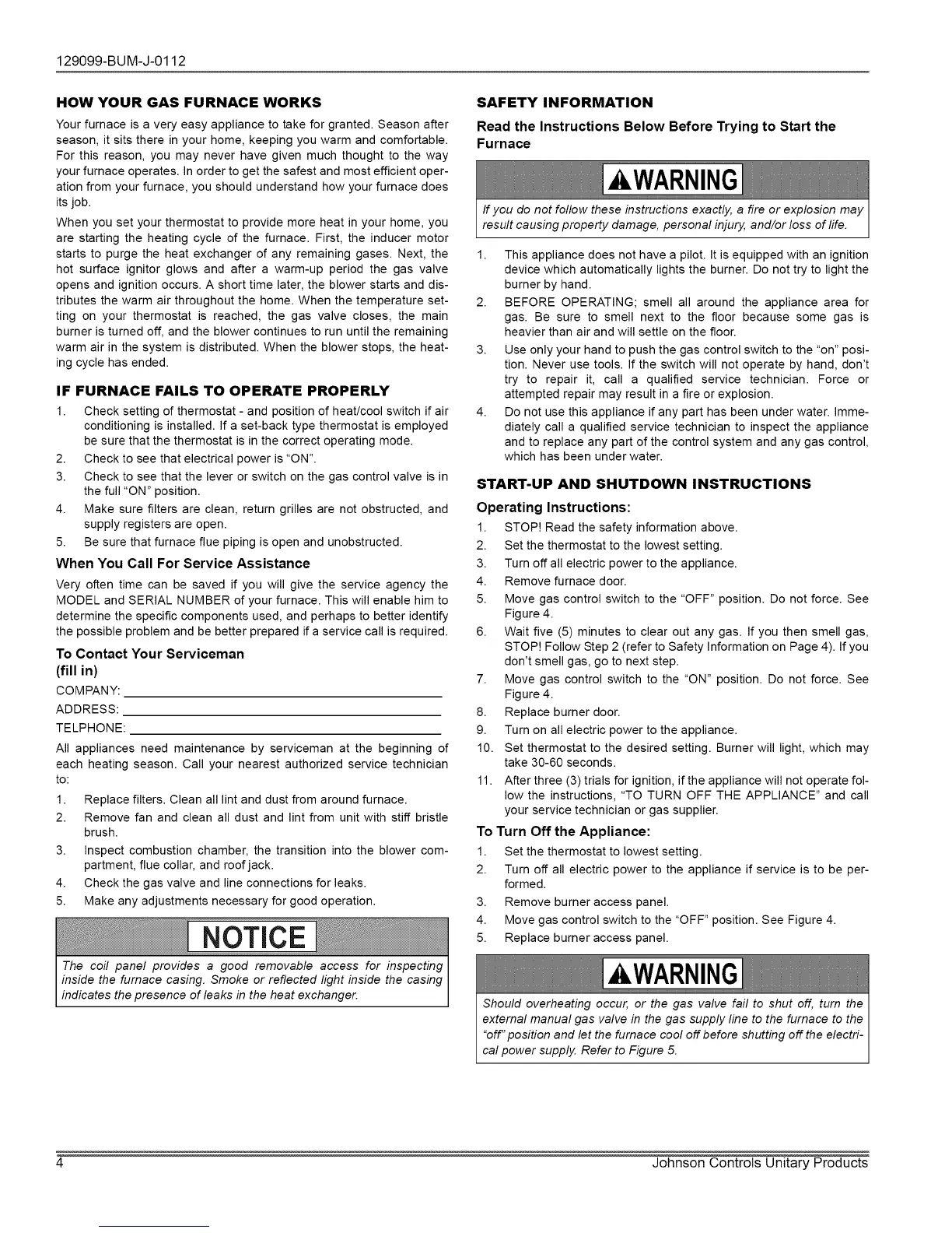 MODEL and SERIAL NUMBER of your furnace. This will enable him to