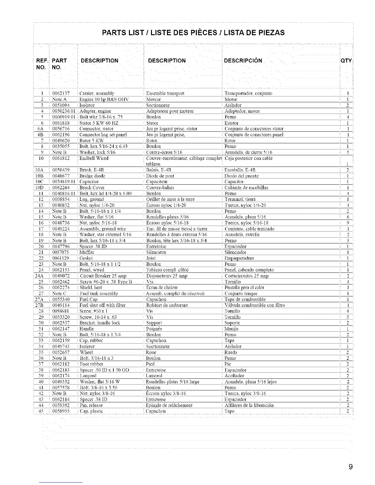 PARTS LIST / LISTE DES PII_CES / LISTA DE PIEZAS