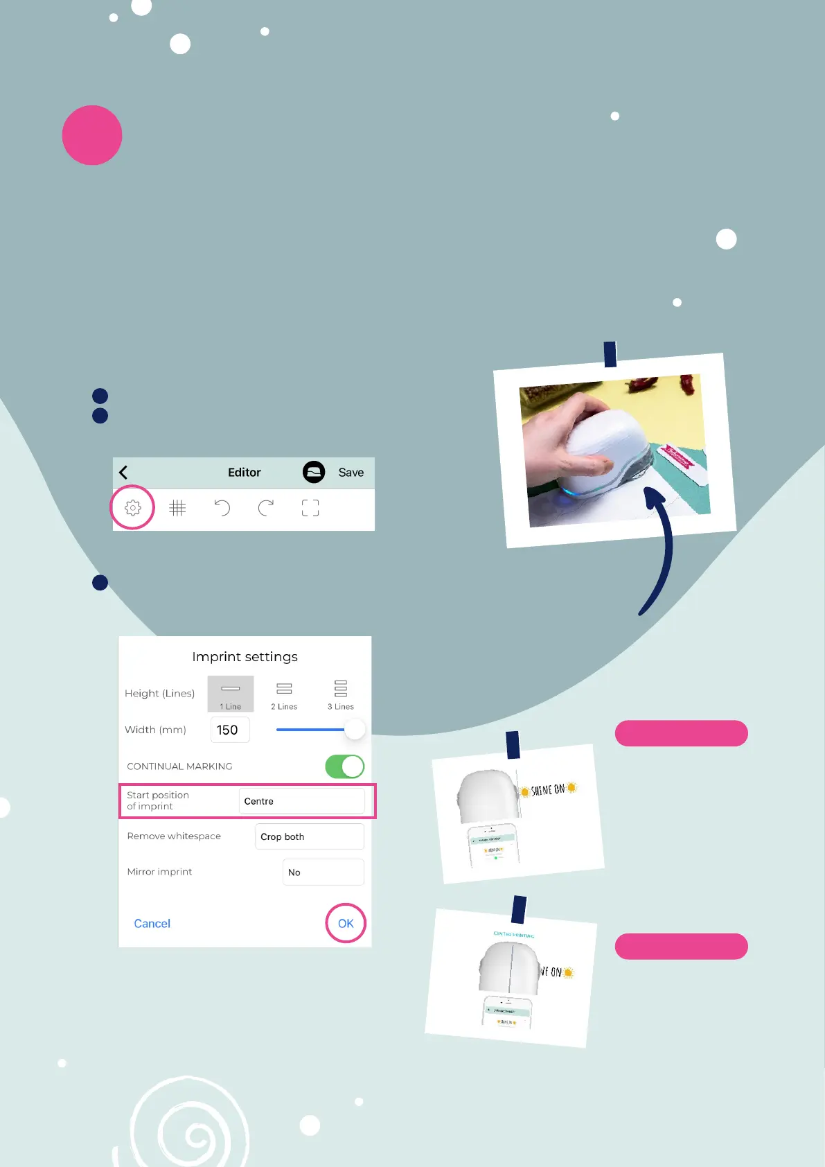 Select centrecentre or laterallateral under Start positonStart positon of imprintof imprint and press okok