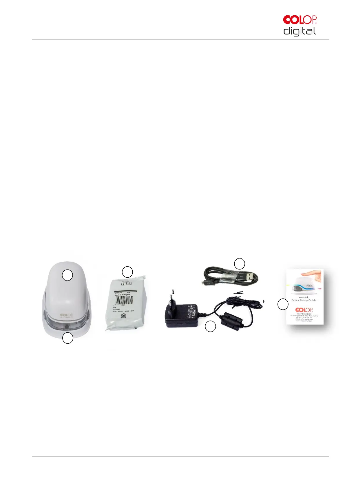 The packaging of the e-mark contains the marking device with rechargeable battery (1), docking station