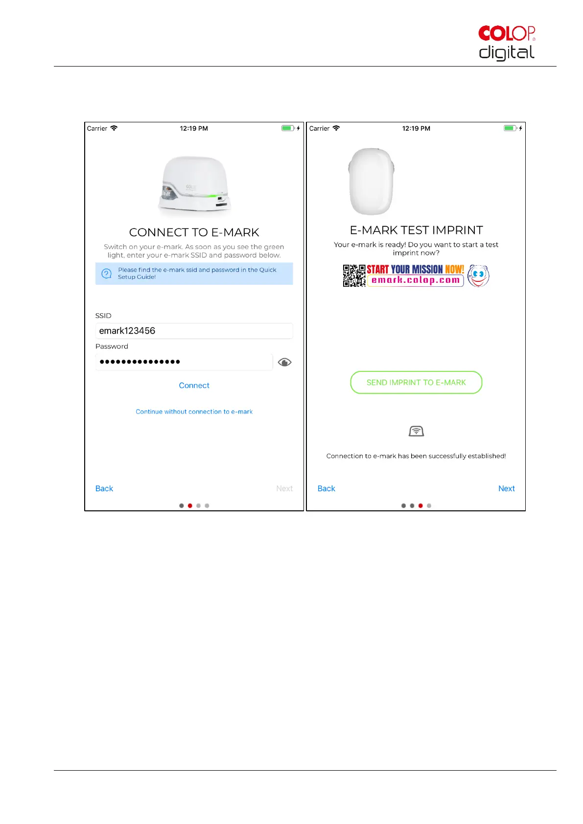 The e-mark is connected to your device via WIFI. A test imprint can now be made.