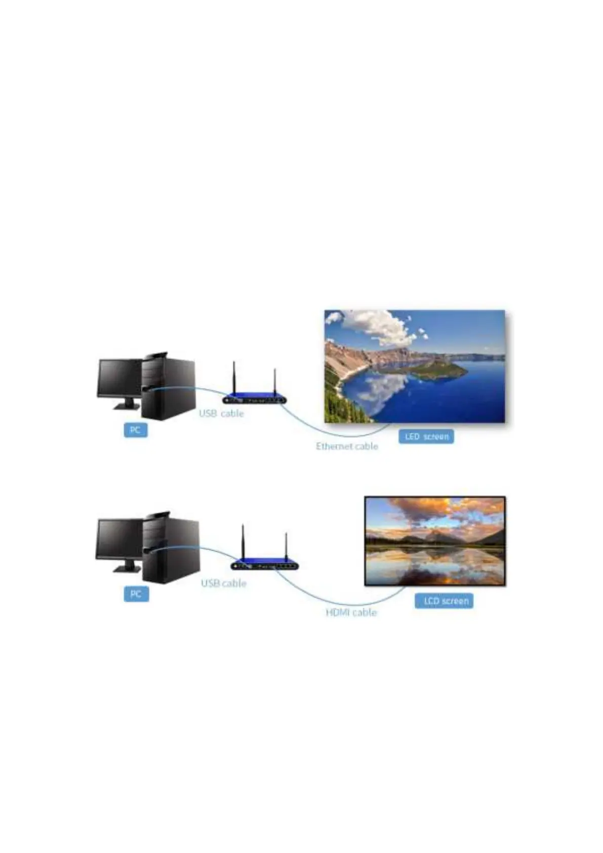 with a USB cable, and then connect it to a LED screen with Ethernet cables, or to a LCD