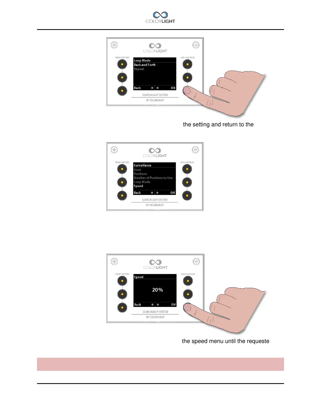 “Speed” is where the speed of the rotation of the searchlight is set. Default setting is 50% of