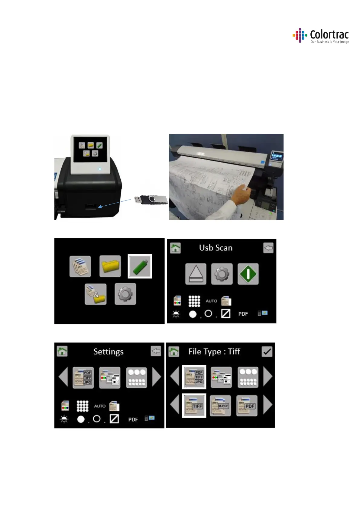 Scan to USB: File type = TIFF. The scan data is stored internally on the scanner, then sent to the