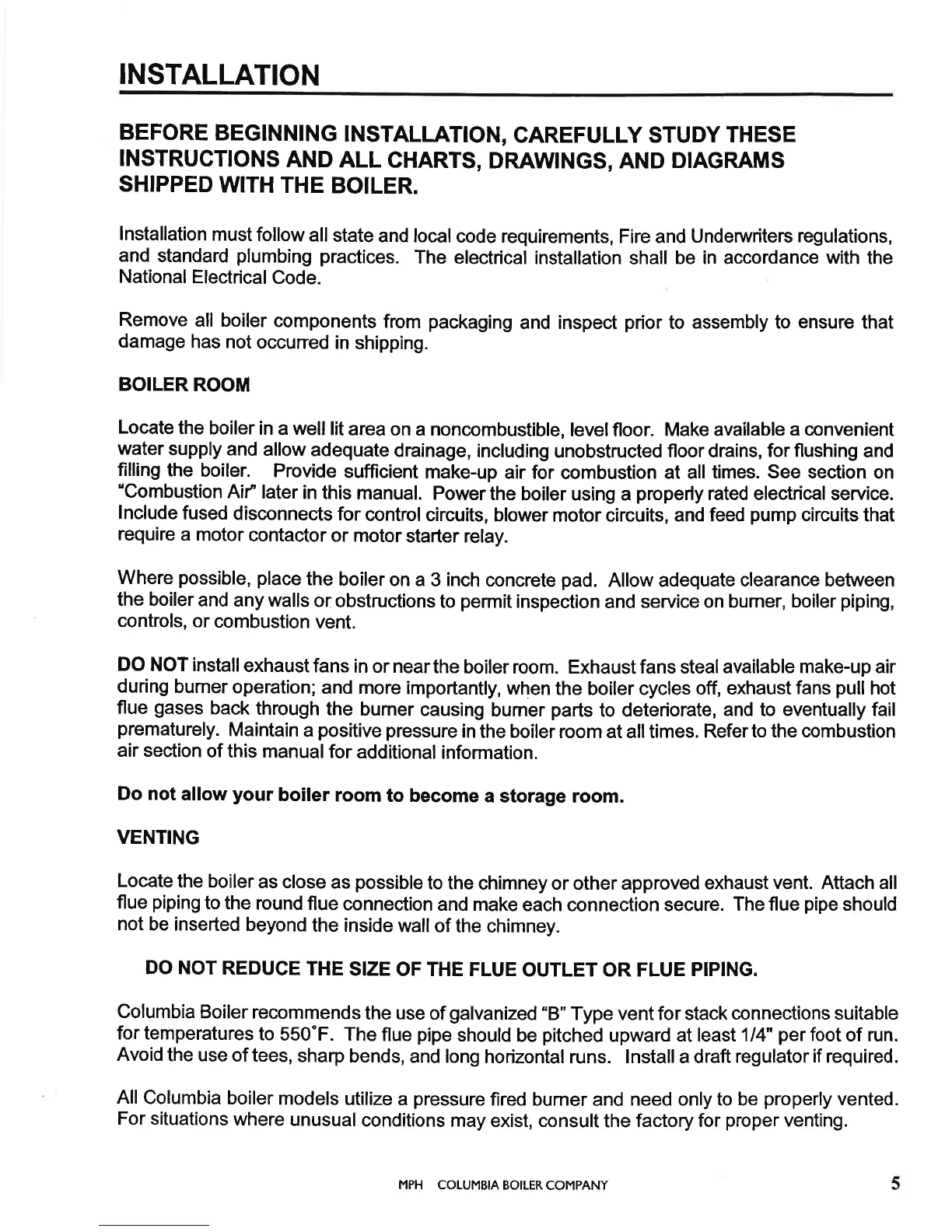 Columbia MPH 40 - Installation; Boiler Room; Venting