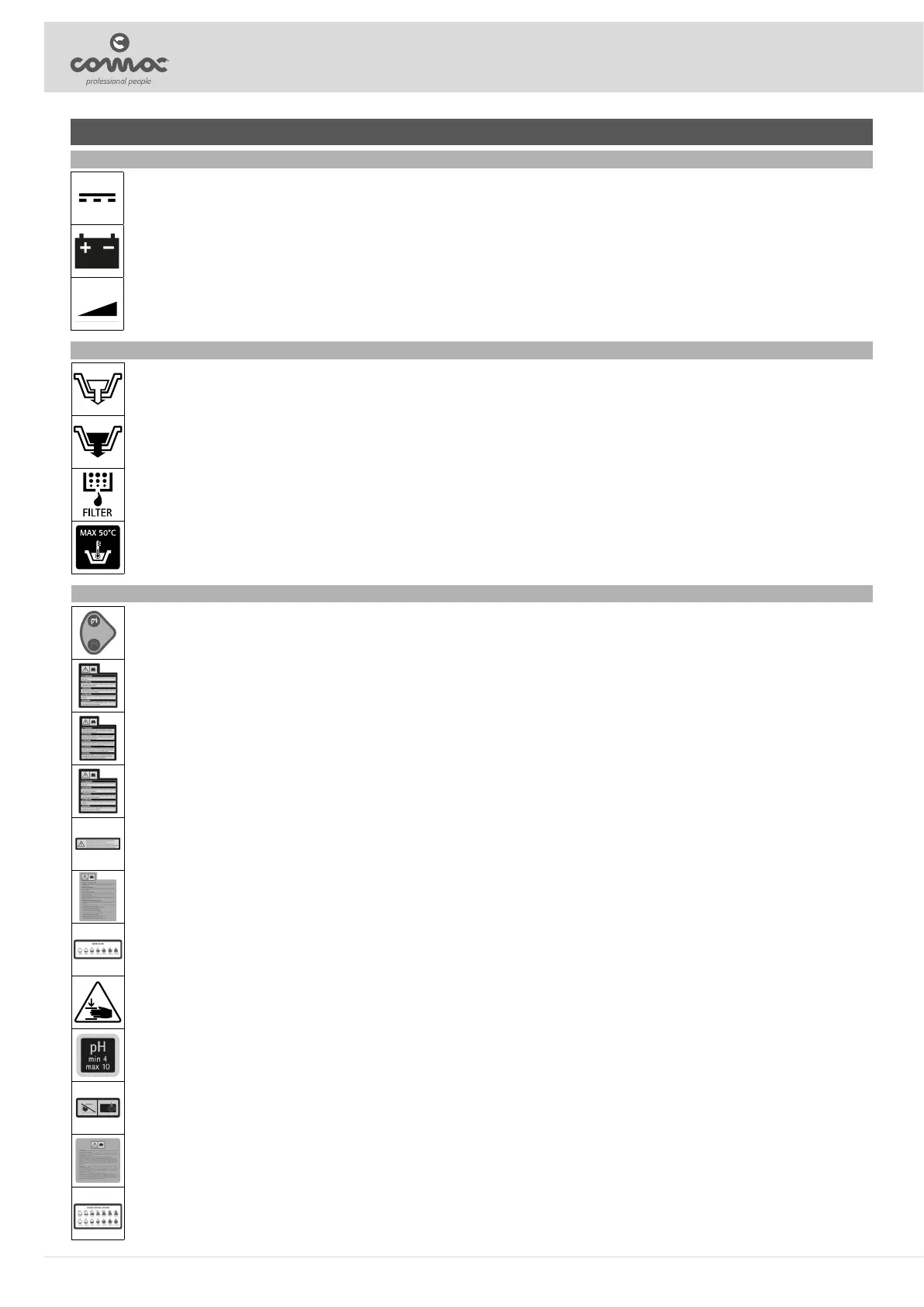 This is used in the rear part of the steering column to warn the user on how to recharge the batteries, and the daily care of the machine is explained in the lower part.
