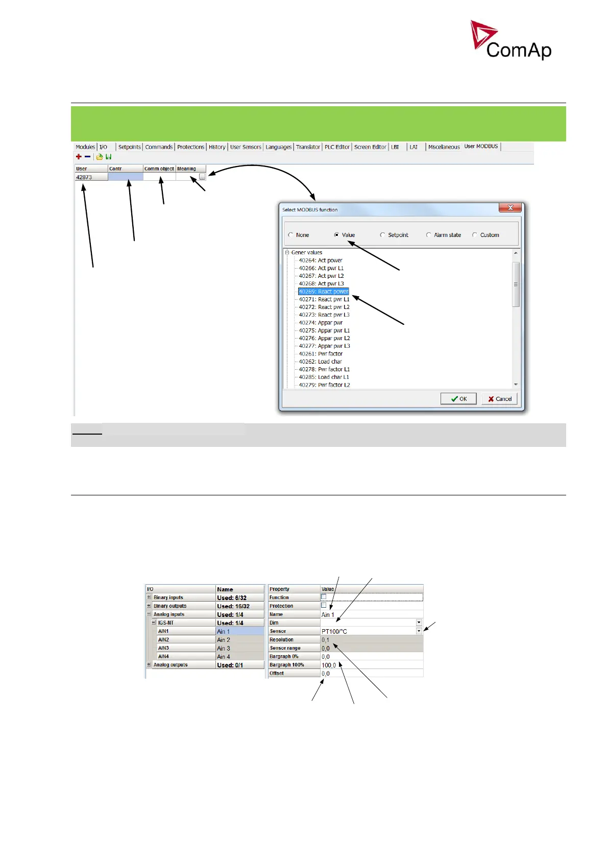 Users can define Modbus registers from 42873 to 43000. Values, setpoints and Alarm states can be