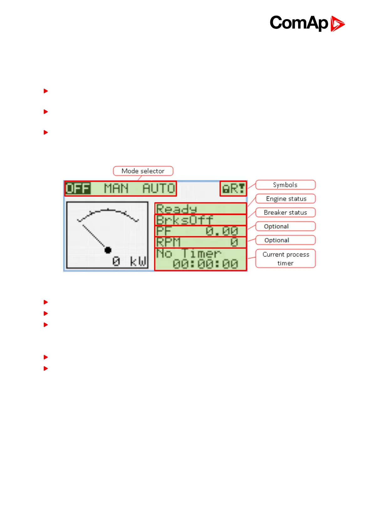 pressure etc., computed values like i.e. gen-set power, statistic data and the alarm list on the last screen.