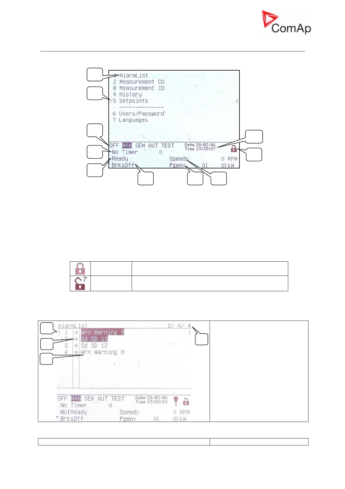 1. Selection of alarm list, measurement, history, setpoints, languages or user screen.