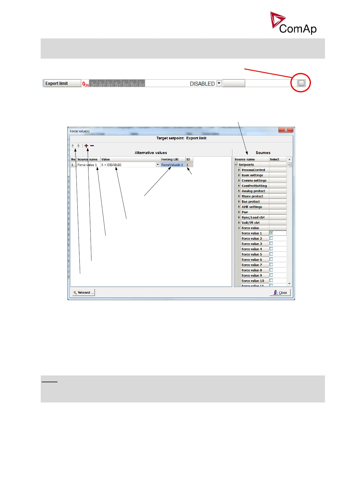 Setpoints that are available for forcing may be identified by Force value button on the right side in GenConfig