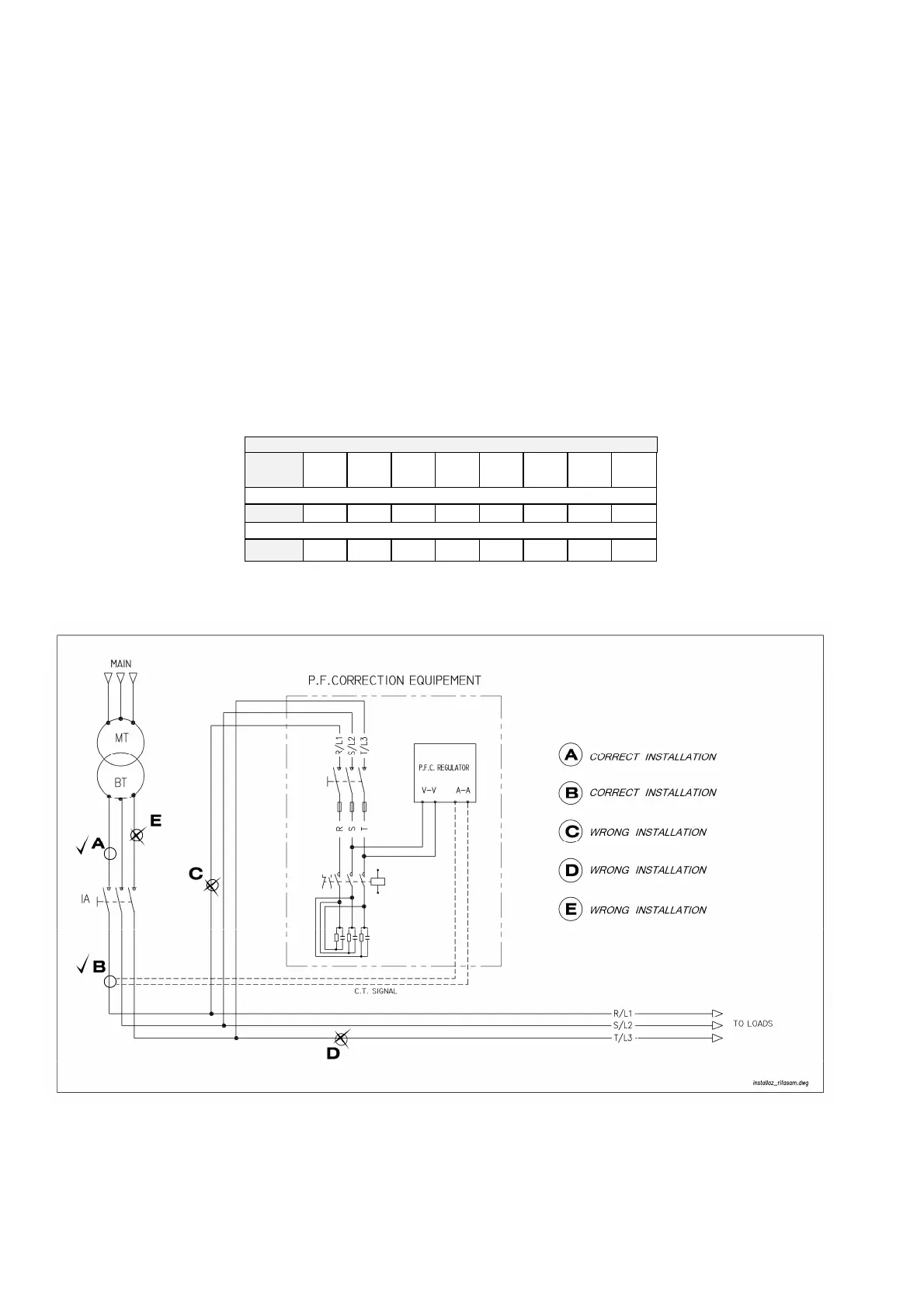 to the table provided below. Protect the feeding line of the P.F. Regulator with fuses or automatic MCCB.