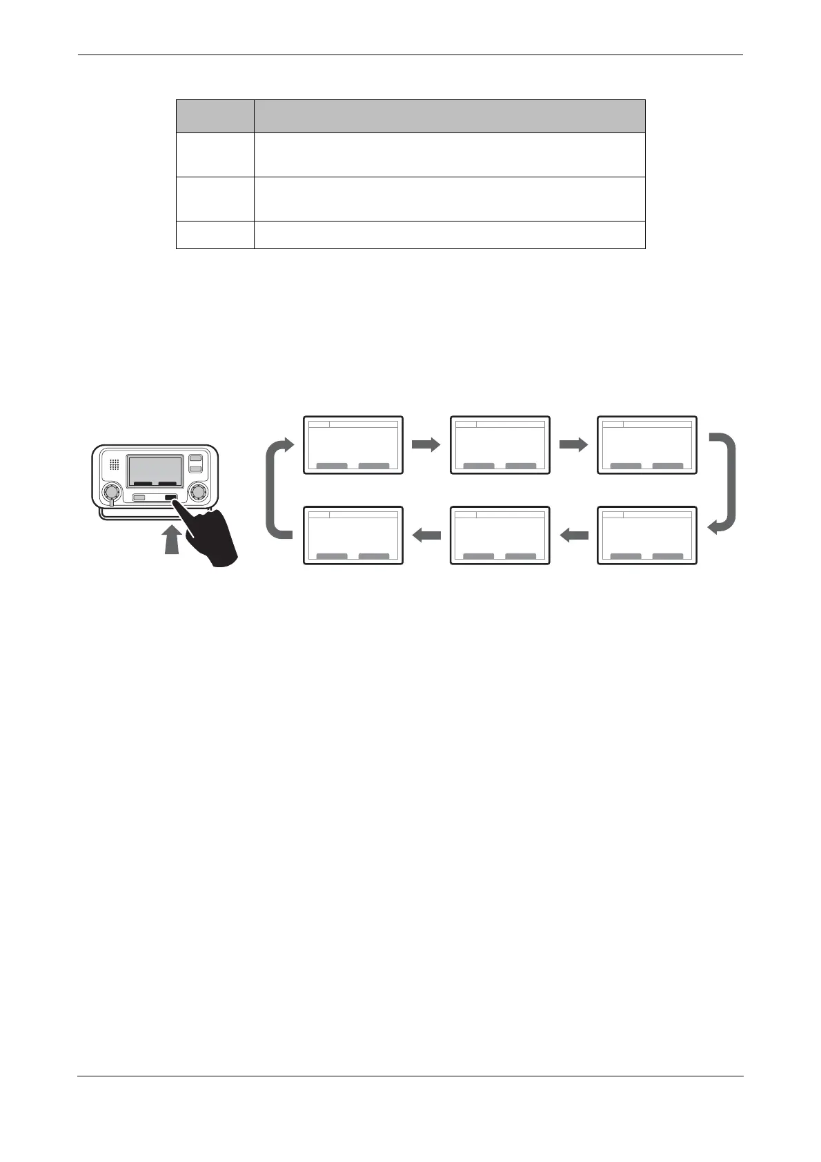 In normal operation the display shows one of six main operating screens. The next screen can be selected at