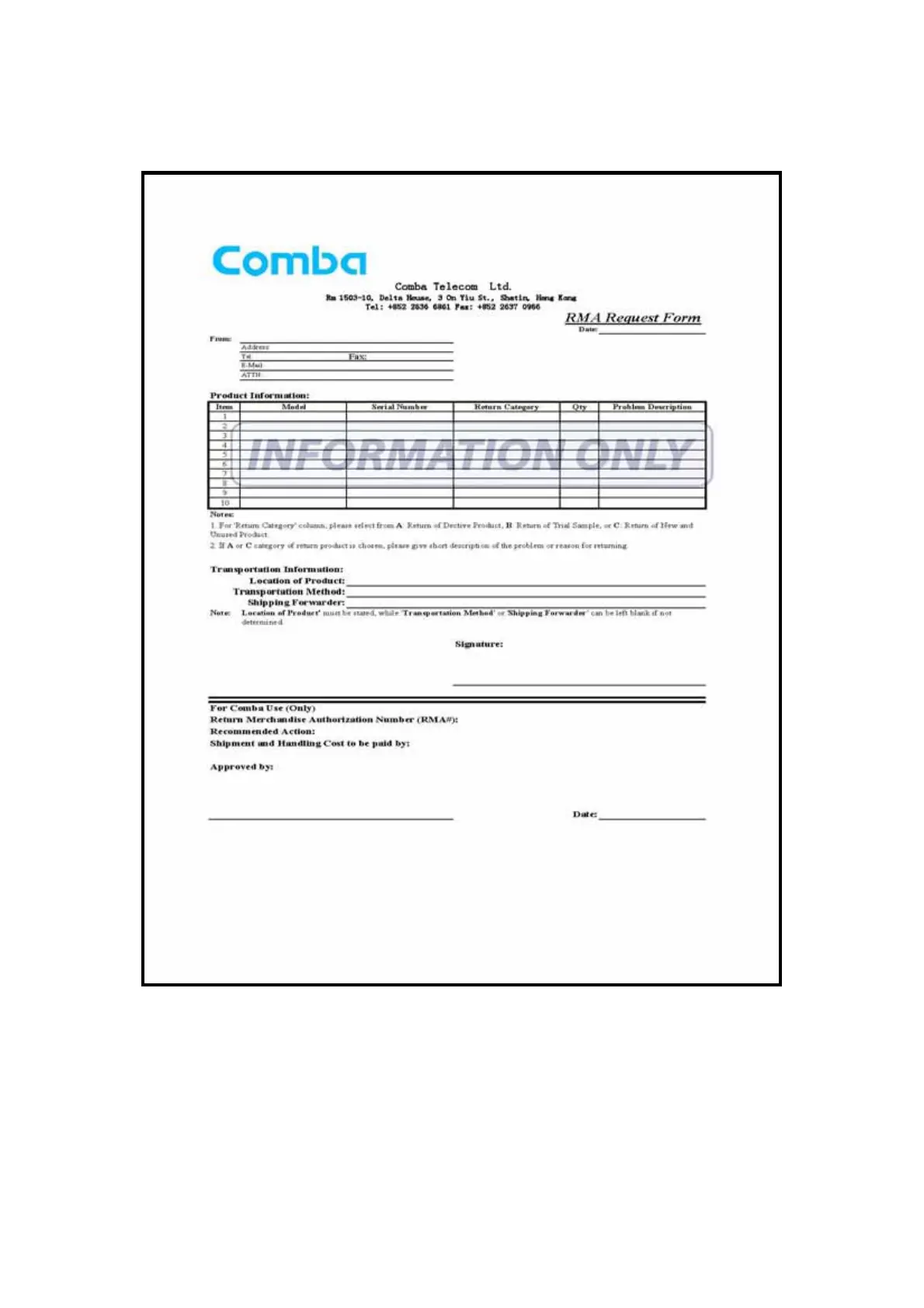 Comba Telecom SP-2110 - Appendix B: Rma (Return Material Authorization) Form