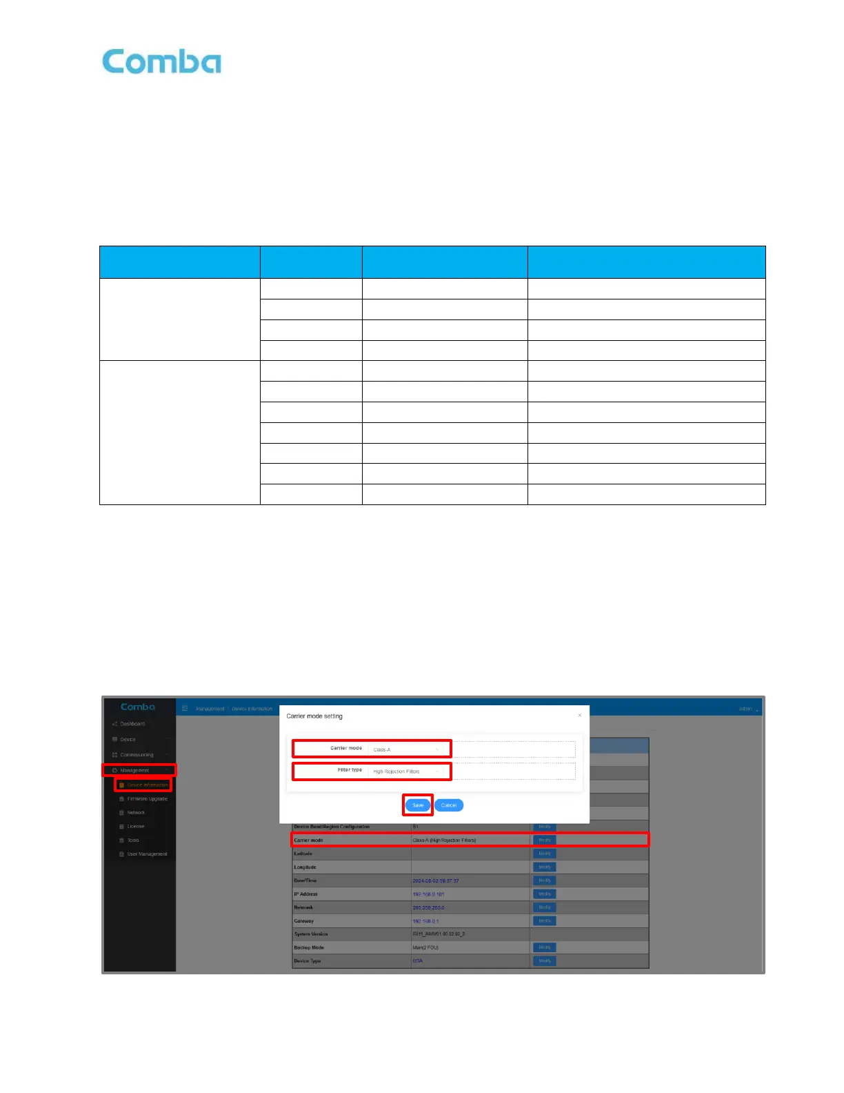 • Login to the BDA/MU and navigate to <Management – Device Information-Carrier Mode>.