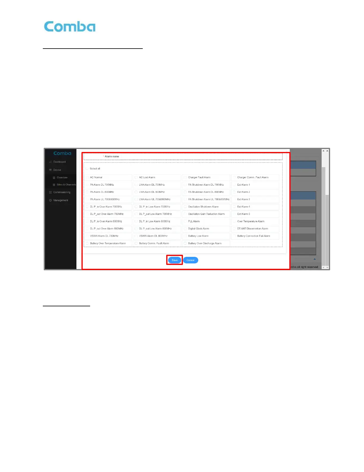 • For BDA Mode, Login to the BDA/MU and navigate to <Device – Overview – Alarm>. For DAS