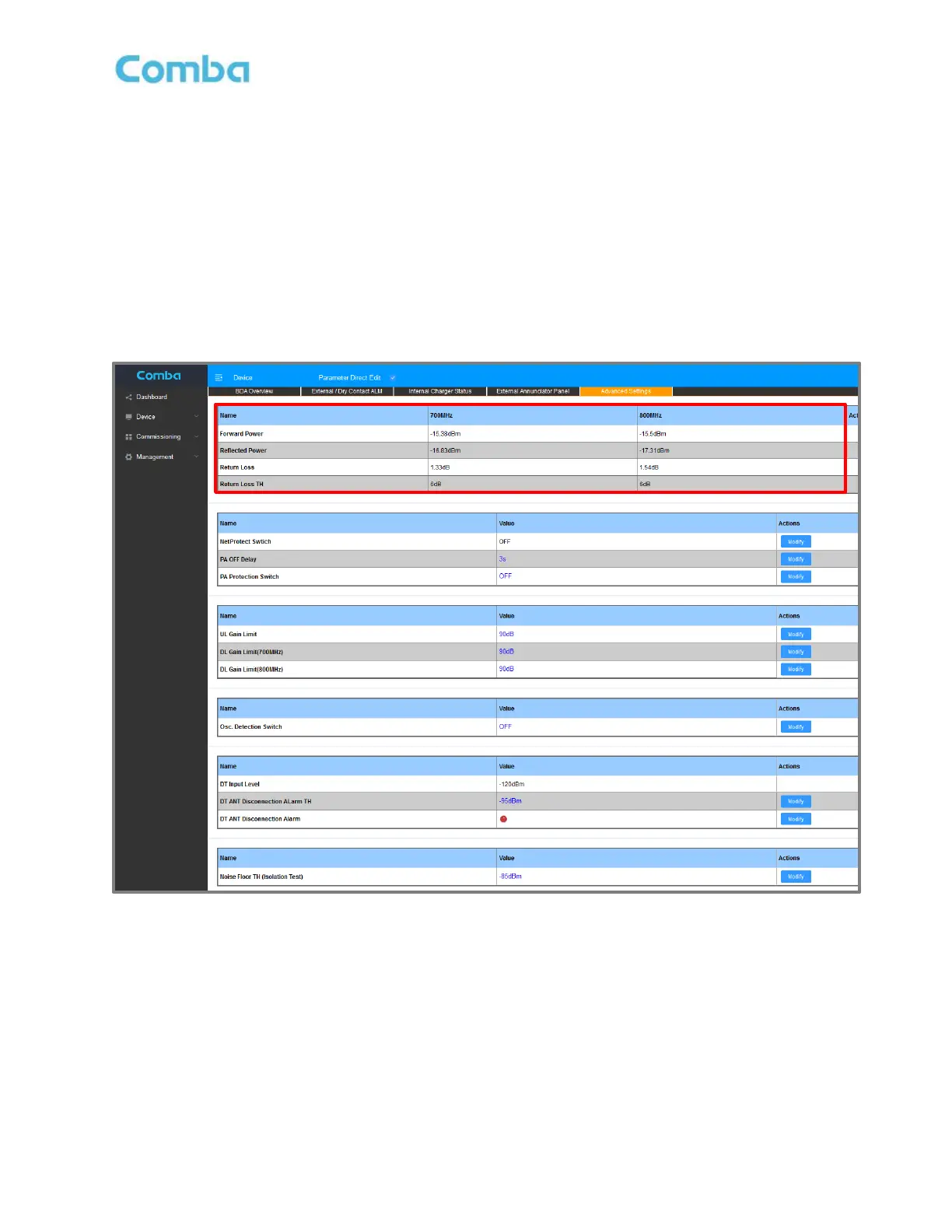 In the Advanced Settings page of each device, the user can view the current DL VSWR/Return Loss