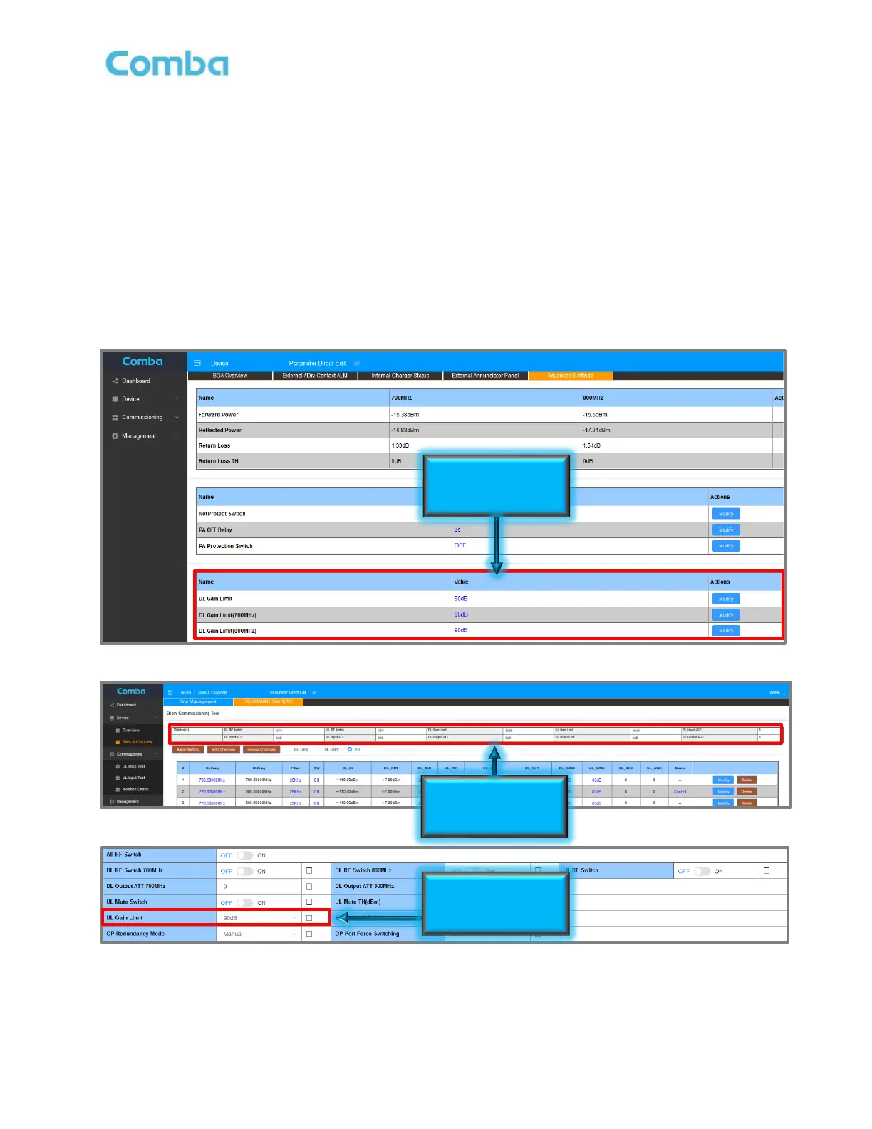 • Click <Modify> in the UL Gain Limit, DL Gain Limit(700MHz), or DL Gain Limit(800MHz) rows to