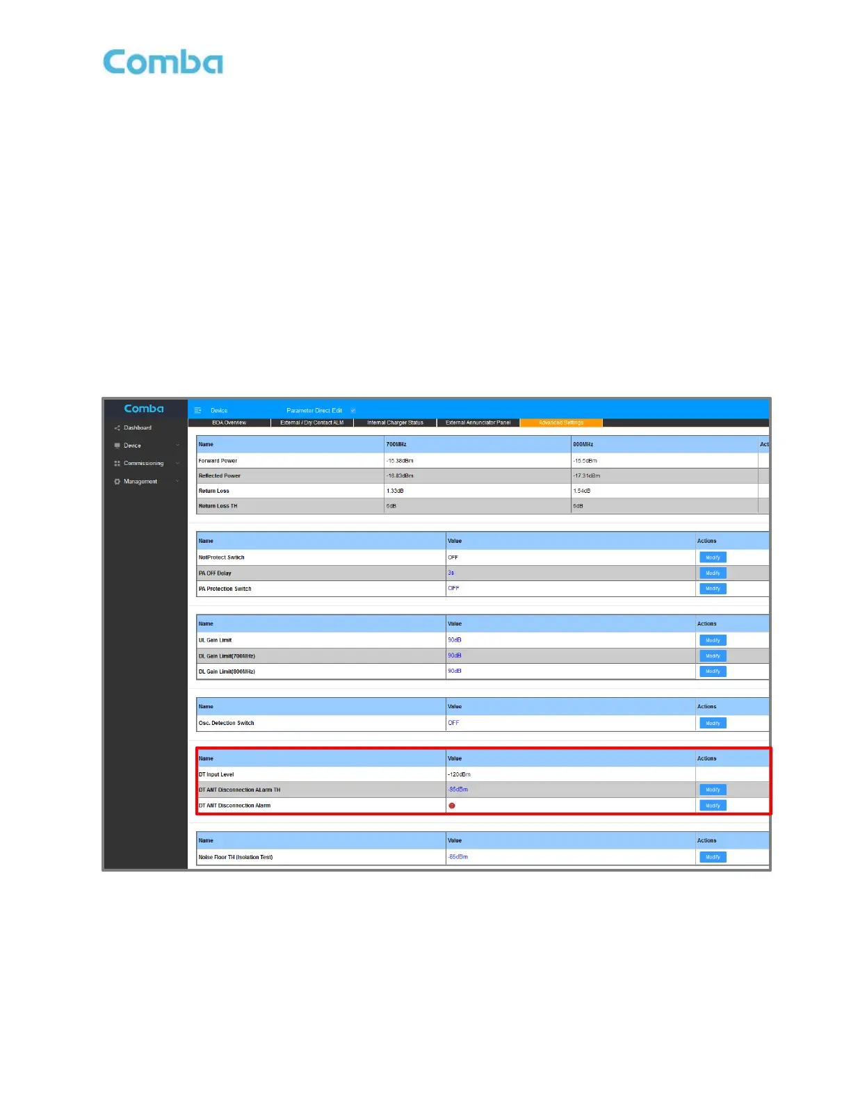 • Click on <Modify> in the <DT ANT Disconnection Alarm TH> row. Modify value accordingly.