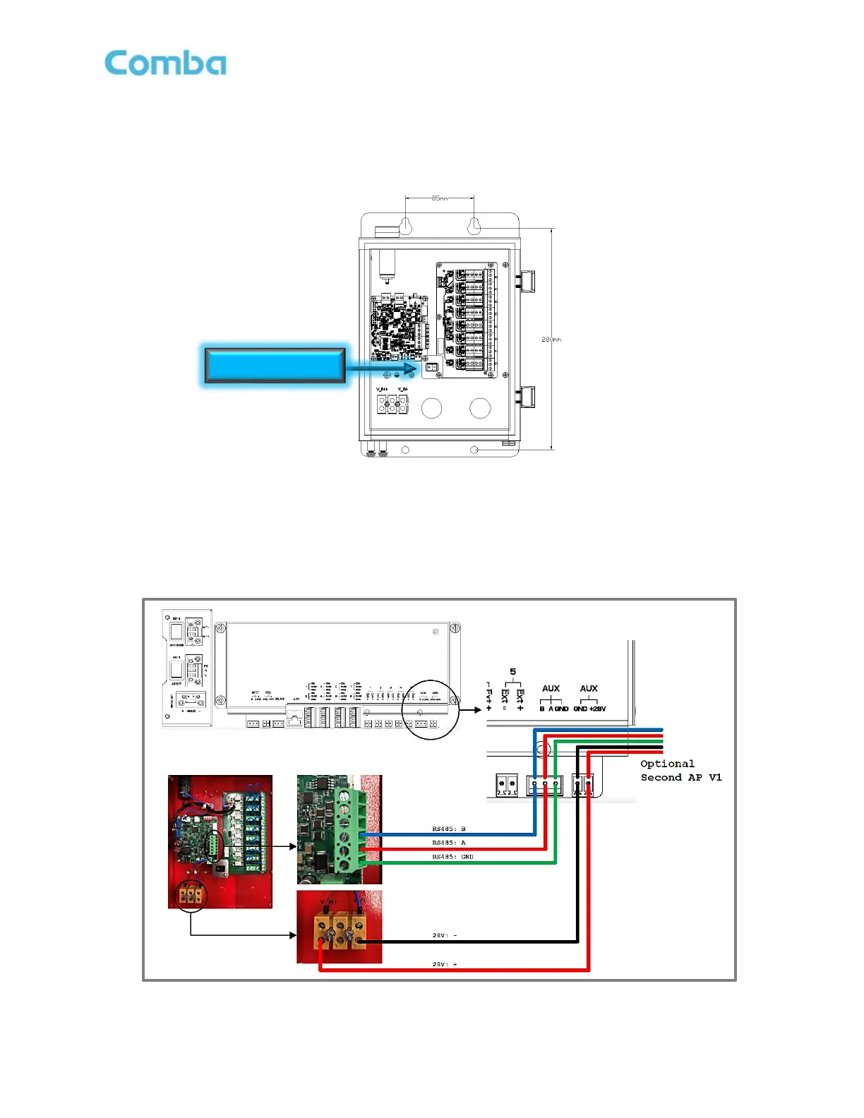 • Connect the 3 x RS485 wires between the BDA/MU/RU “AUX” (A, B, and GND) terminals to the V1