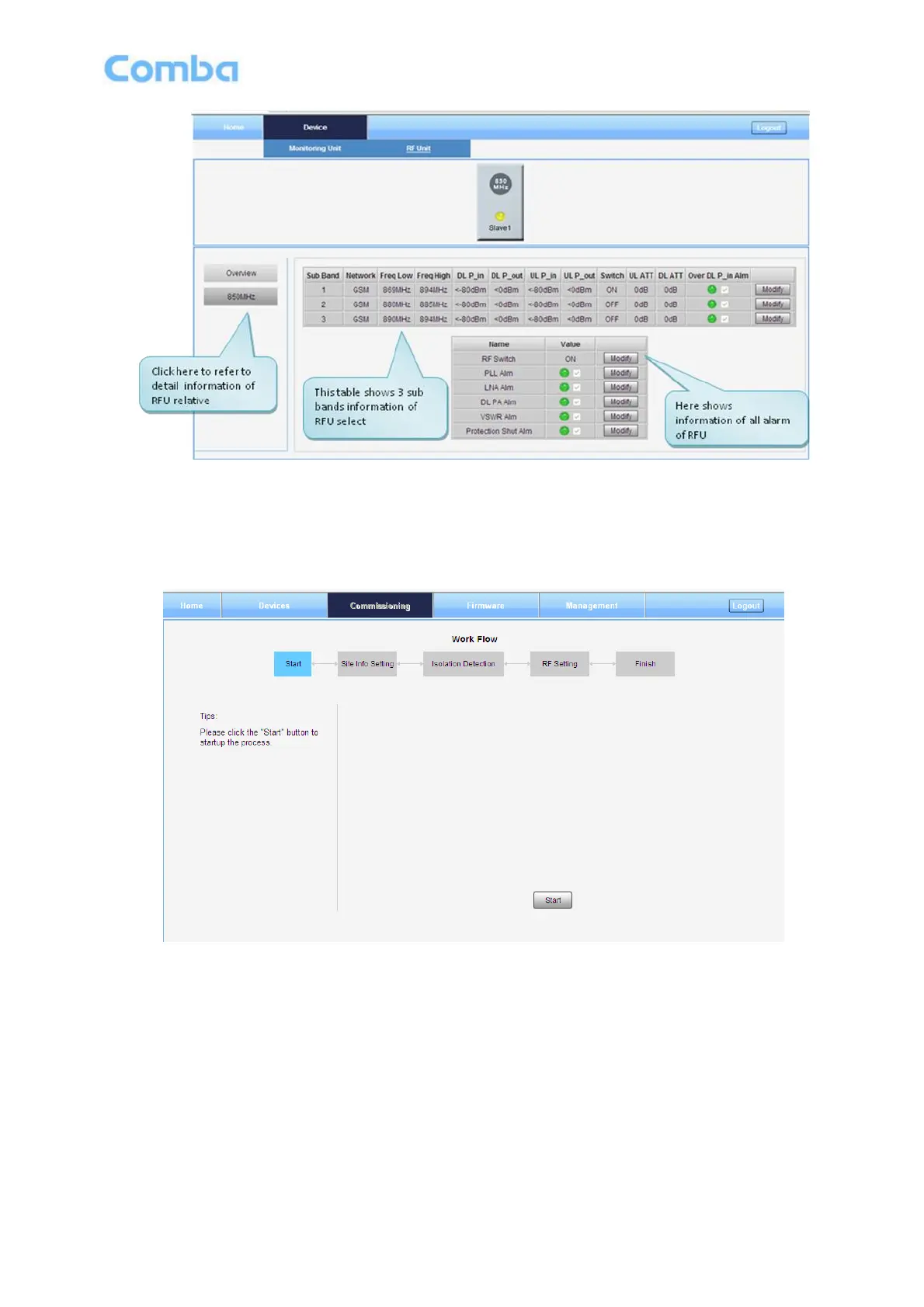 A work flow of the commissioning process is shown on [Commissioning] Screen. Click the [Start] button, the