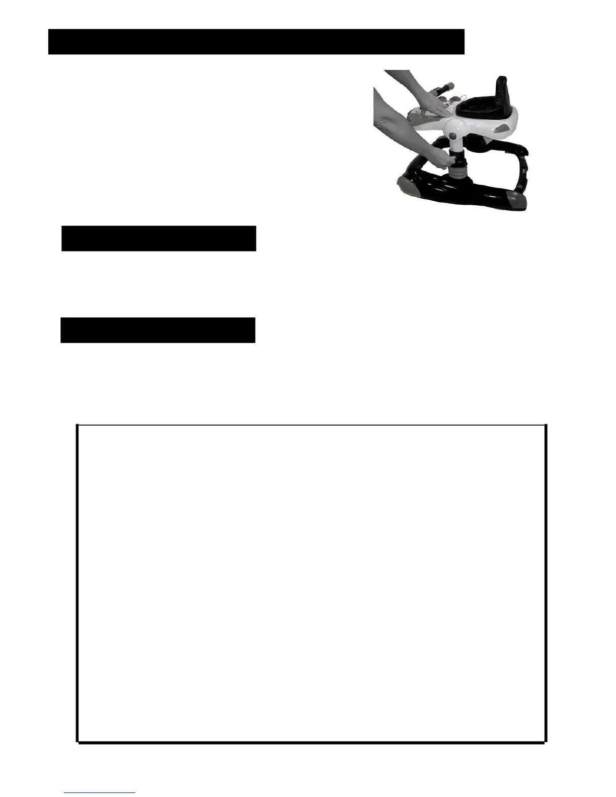 STORE IN A COOL AND DRY AREA, especially in the summer. Do not store the Activity Walker in the trunk of a