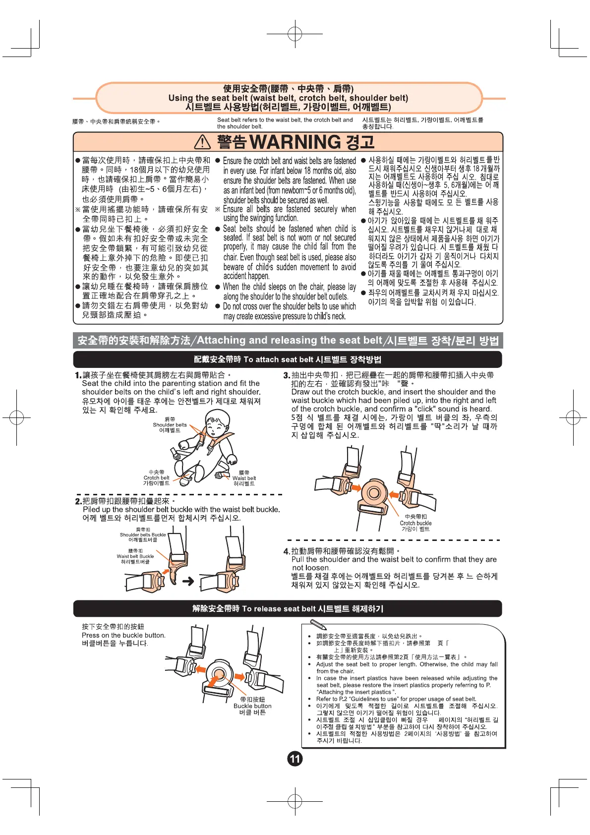 Combi BEDi - Using Seat Belts; WARNING; Attaching and Releasing Seat Belts
