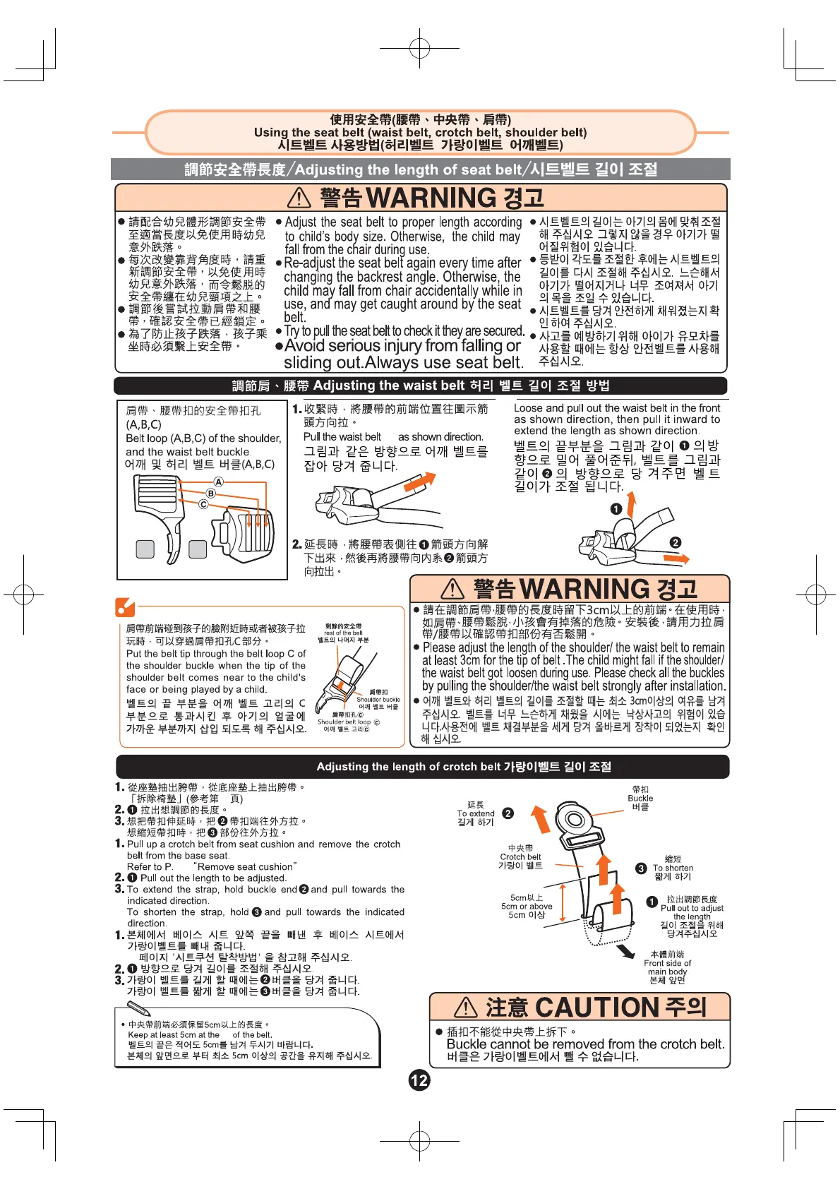 Combi BEDi - Adjusting Seat Belt Length; WARNING; Adjusting Waist Belt Length; Adjusting Crotch Belt Length