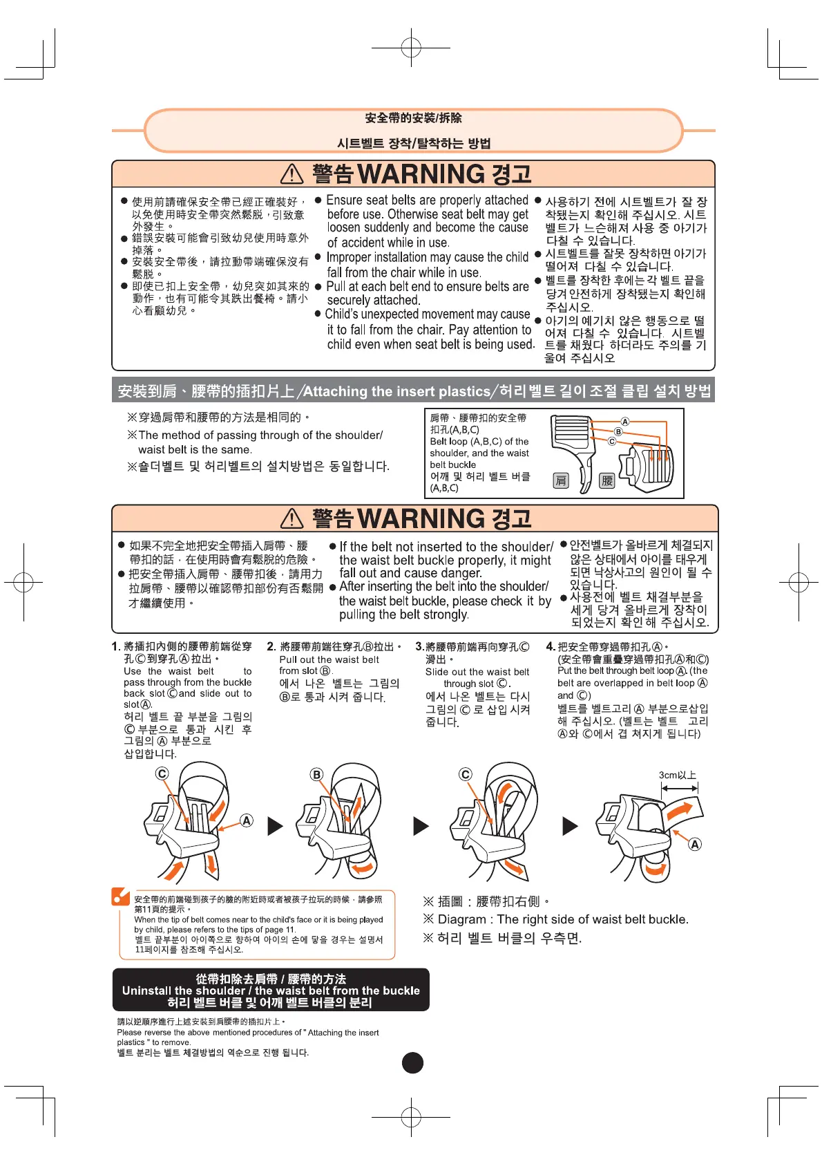 Combi BEDi - Seat Belt Attachment;Removal; WARNING; Attaching Insert Plastics; Detaching Belts from Buckles
