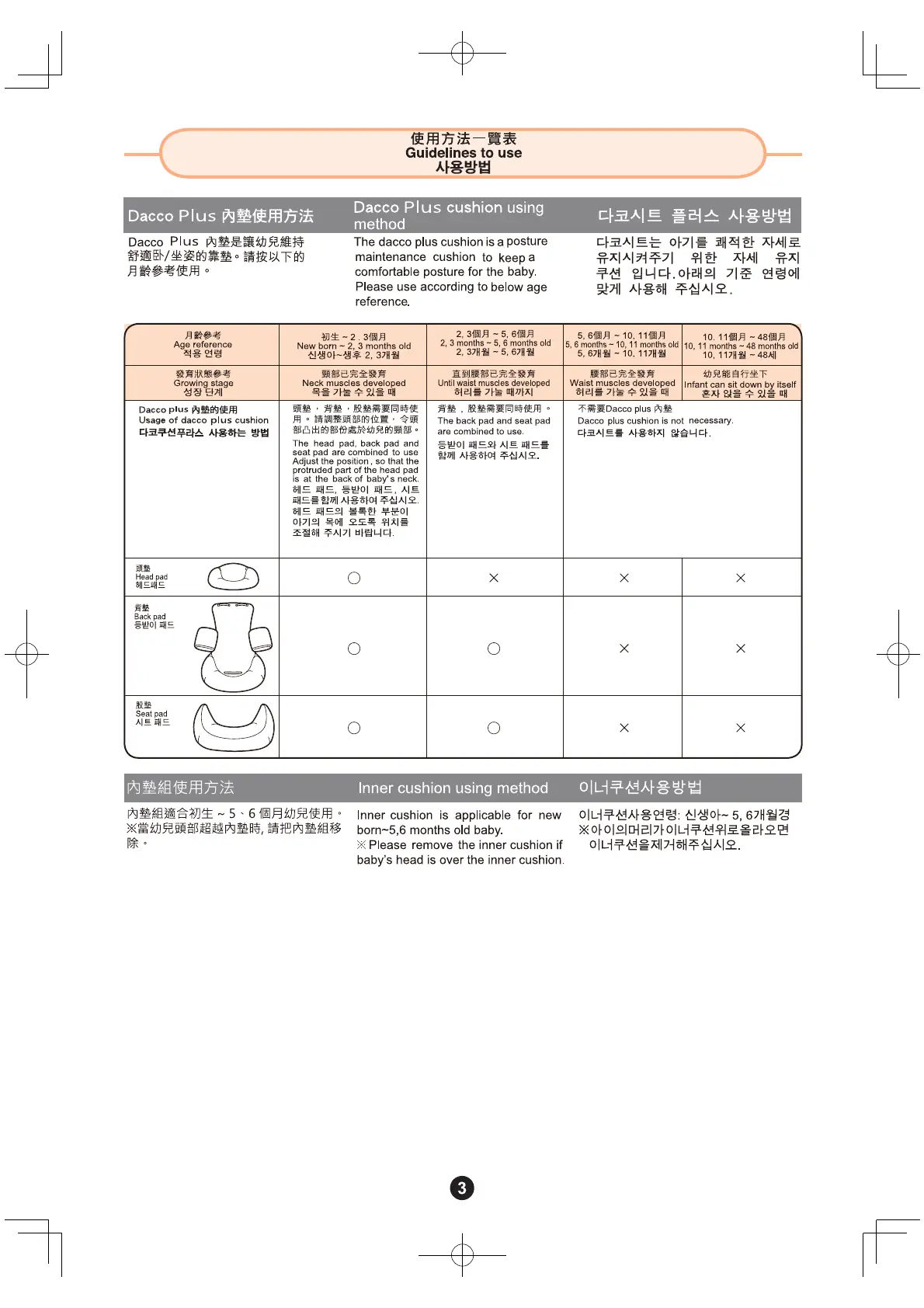 Combi BEDi - Dacco Plus Cushion Usage; Age Reference for Dacco Plus; Growth Stage for Dacco Plus; How to Use Dacco Plus Cushion