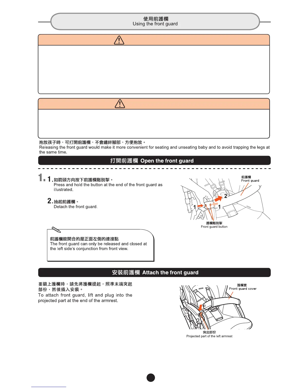 Do not let the child operate the front guard. It may make the child to fall off from the stroller.