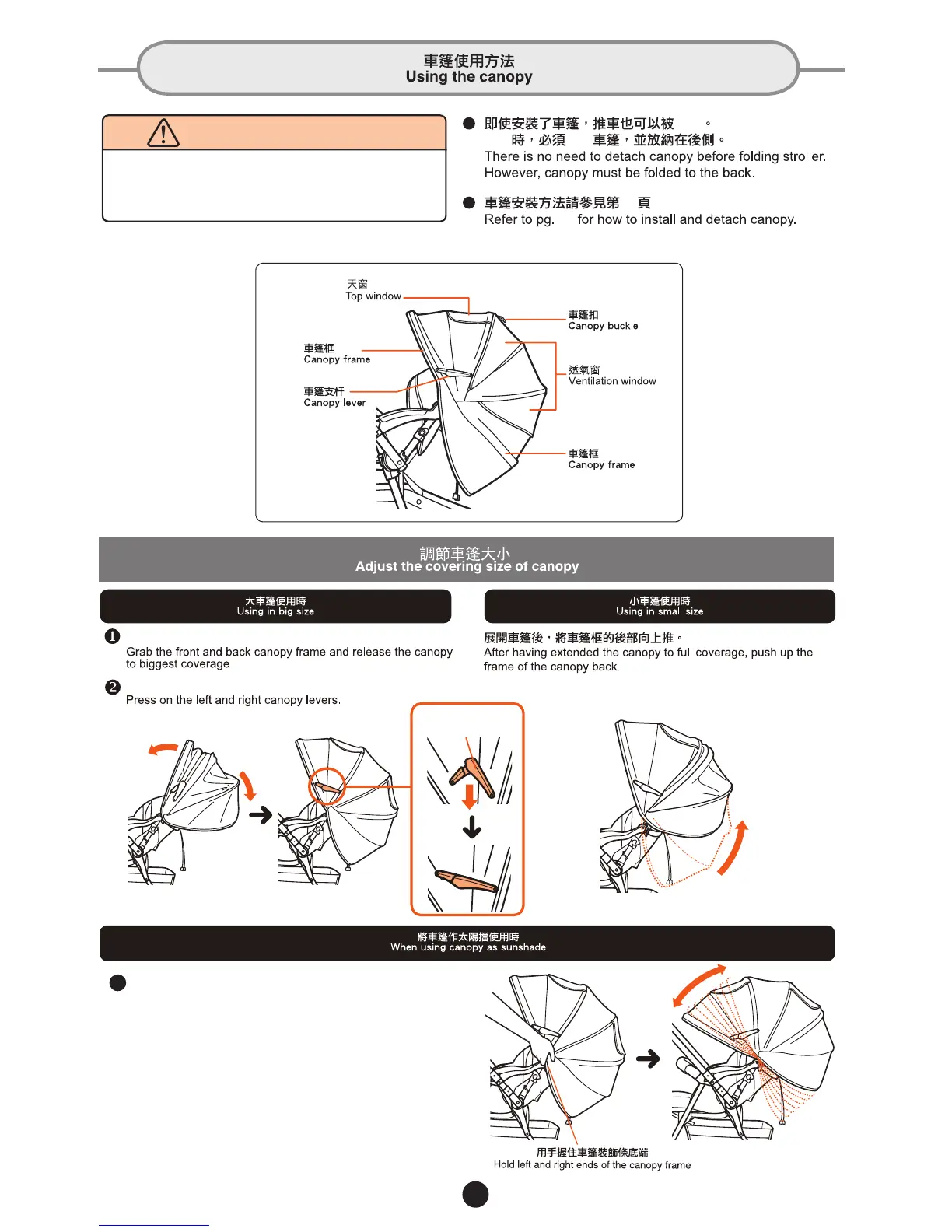 在折疊以及打開車篷時,請注意不要夾到幼兒的手指。