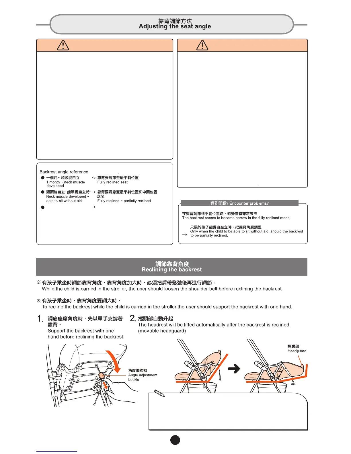● 不要一邊推行推車,一邊調節靠背角度,非常危險