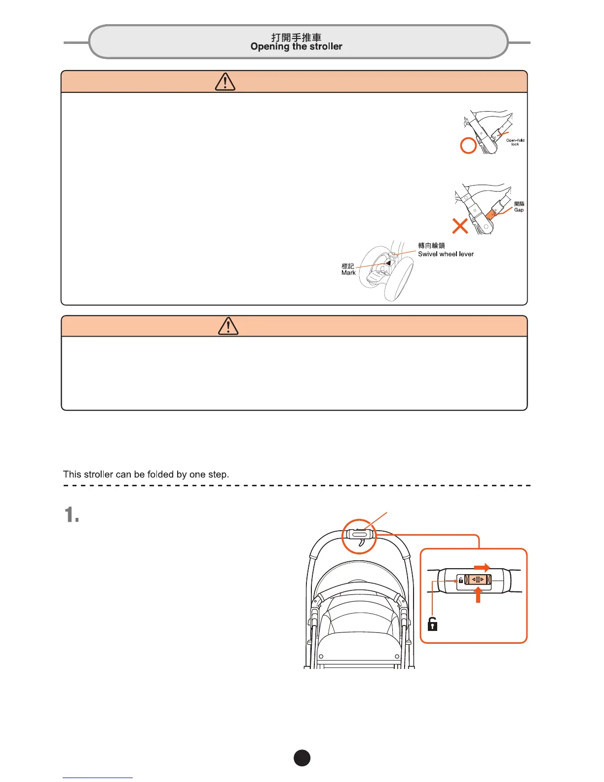 ● 打開嬰兒手推車不要讓他人接觸,以免意外夾傷。