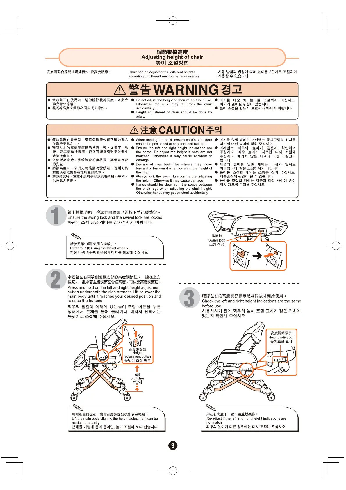Combi Dreamy - 調節餐椅高度 Adjusting height of chair 높이 조절방법; 高度調整的安全警告與注意事項; 餐椅高度調整步驟