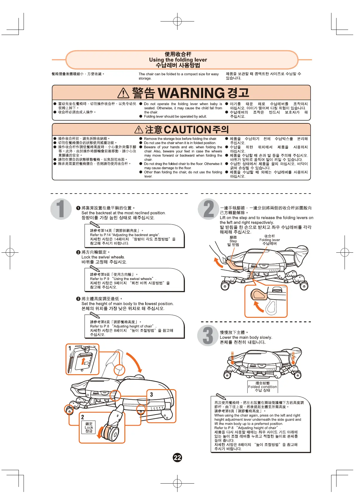Combi Dreamy - 使用收合杆 Using the folding lever 수납레버 사용방법; 折疊功能的警告與注意事項; 餐椅折疊步驟