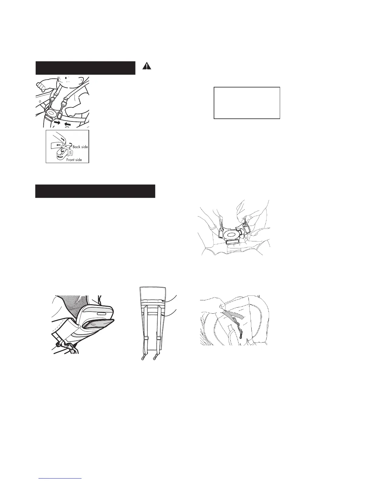 To adjust the harness or waist belt, loosen the slack on both sides of each