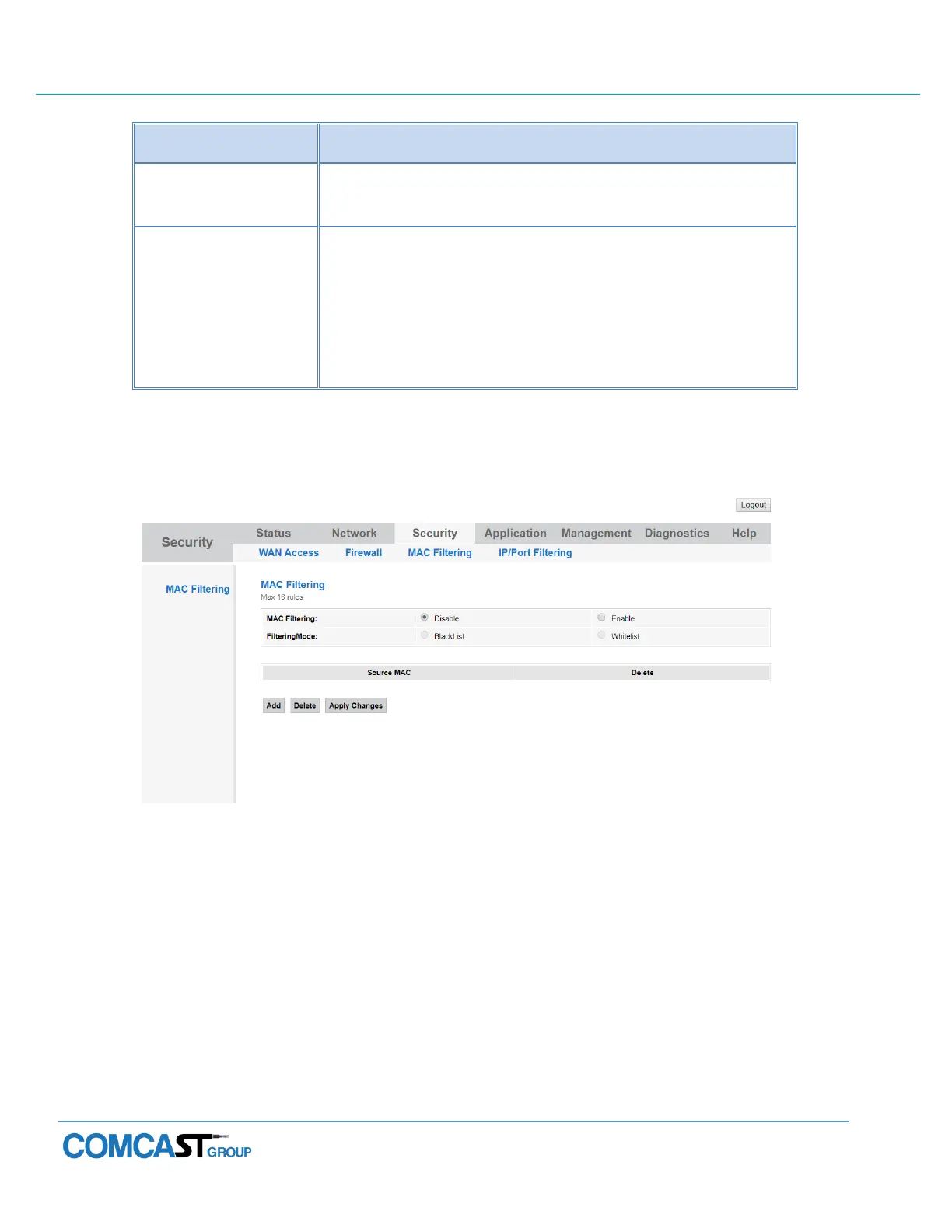 This page allows the user to set the relevant parameters of the MAC filter function. The user