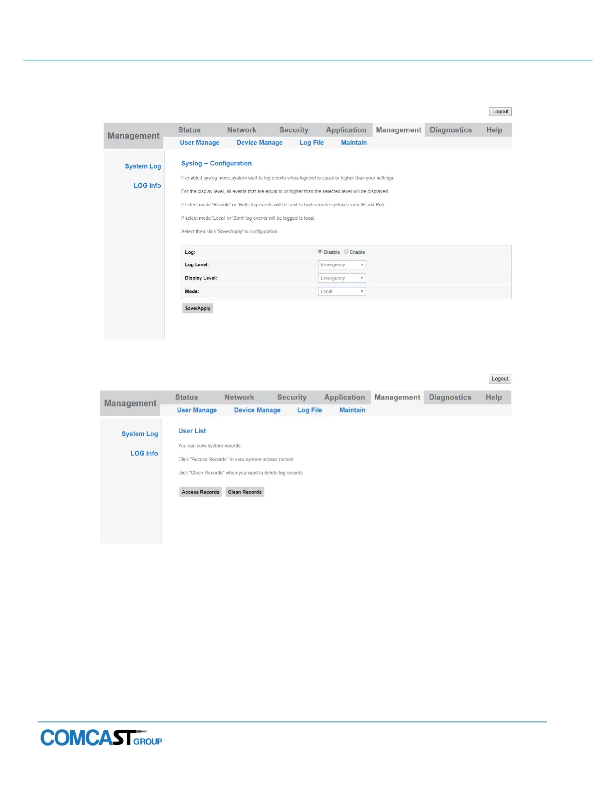 Comcast 781W - Log File Configuration; Diagnosis; Network Diagnosis