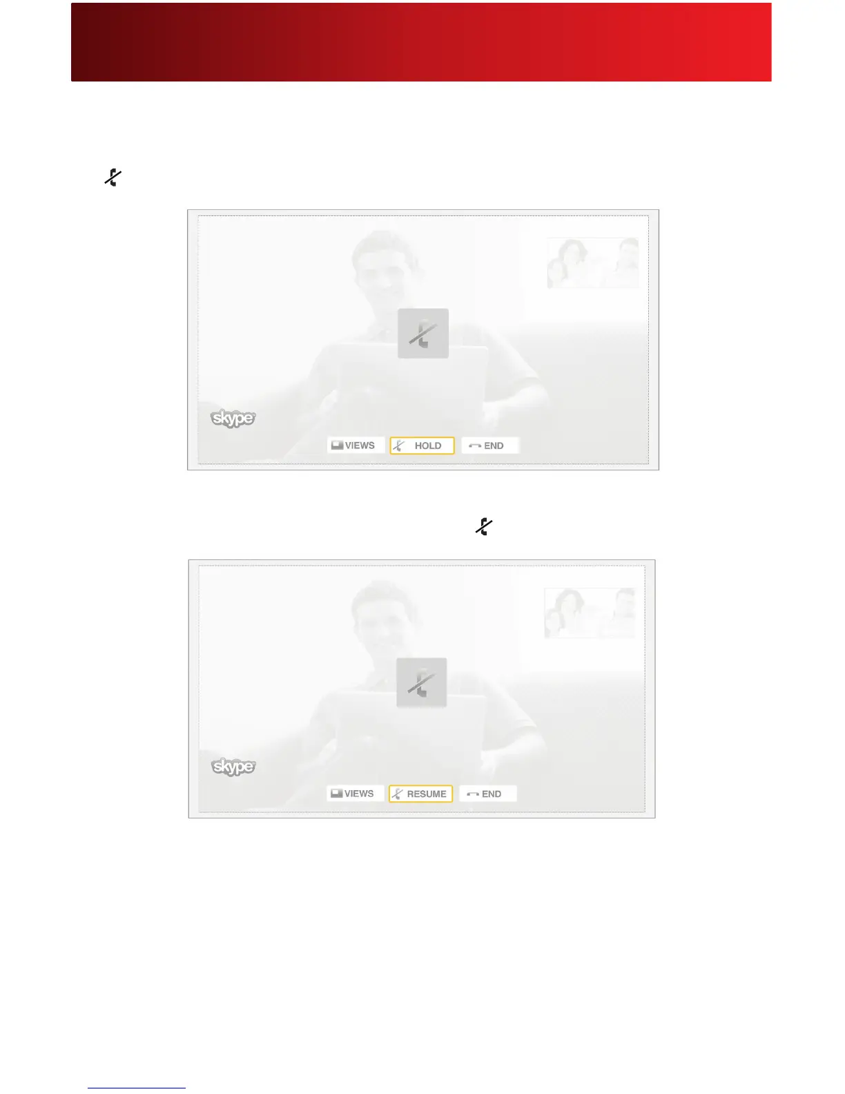 To pause the transmission of video and audio from your microphone, click Hold on your screen or press