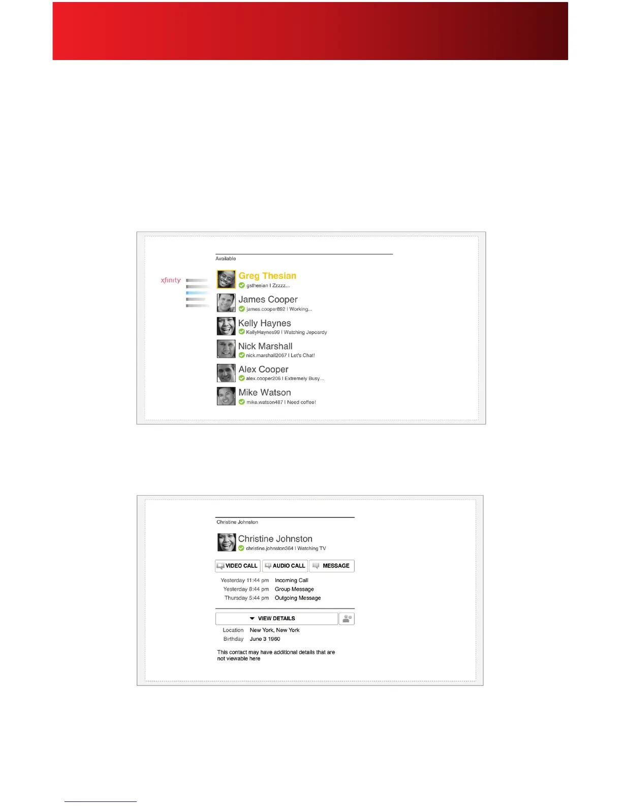 Select a contact to view their prole picture, name, status, mood and other information. Your contacts are