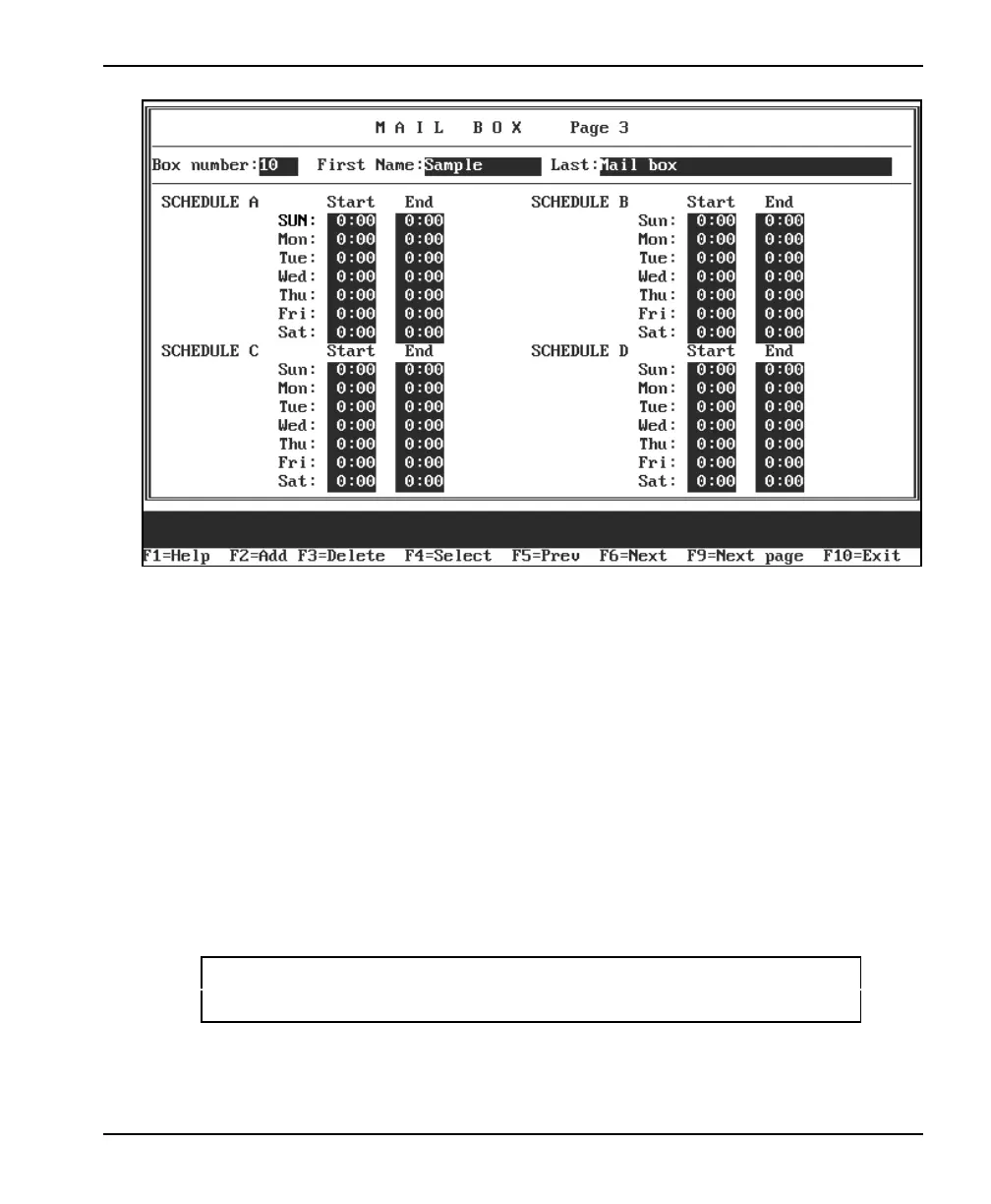 3. To go to Page 4 of the Mail Box setup screen, press <F9>. The Page 4 screen displays.