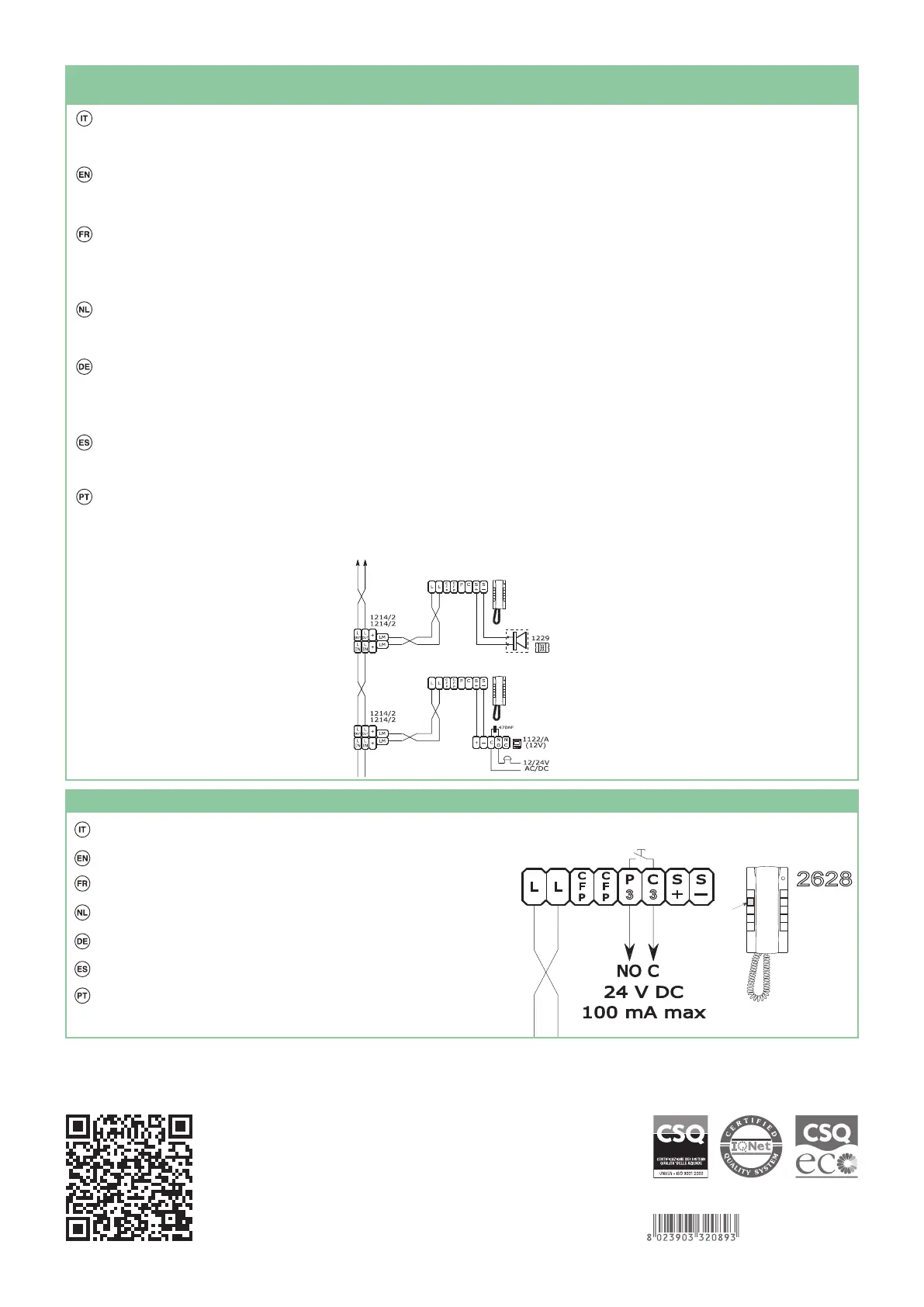 Aansluiting van een extra bel op deurtelefoon 2628:Het maximale aantal toestellen met dezelfde gebruikerscode plus hetaantal extra bellen mag nooit groter zijn