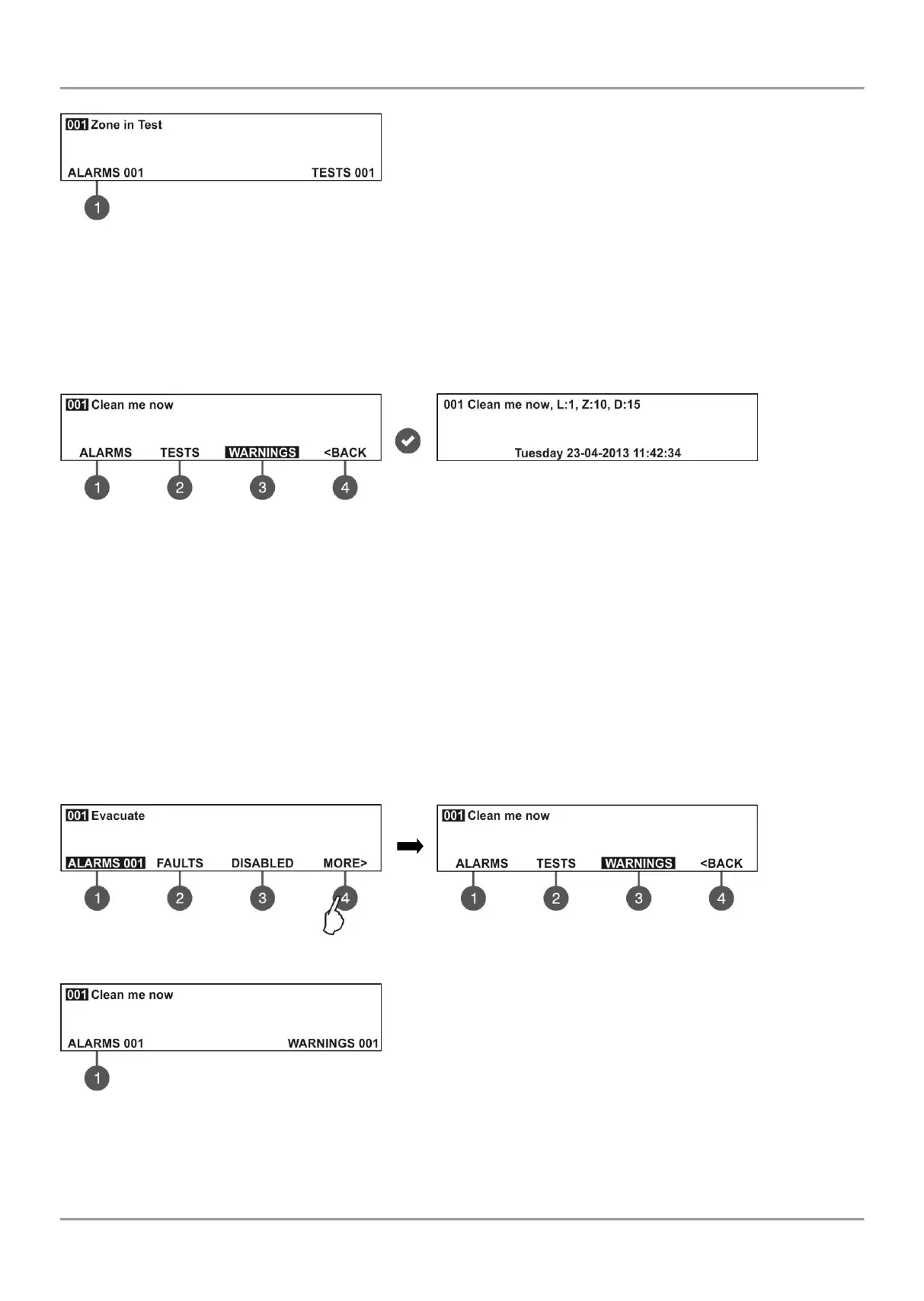 The messages for warnings are displayed with low priority. If no alarm or fault events or disablements and tests are